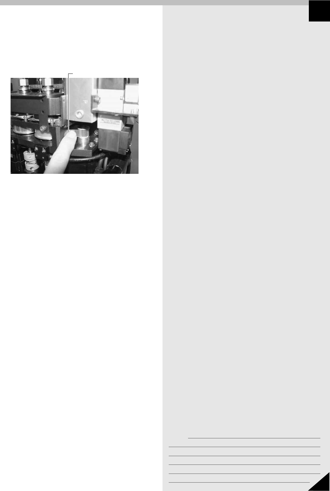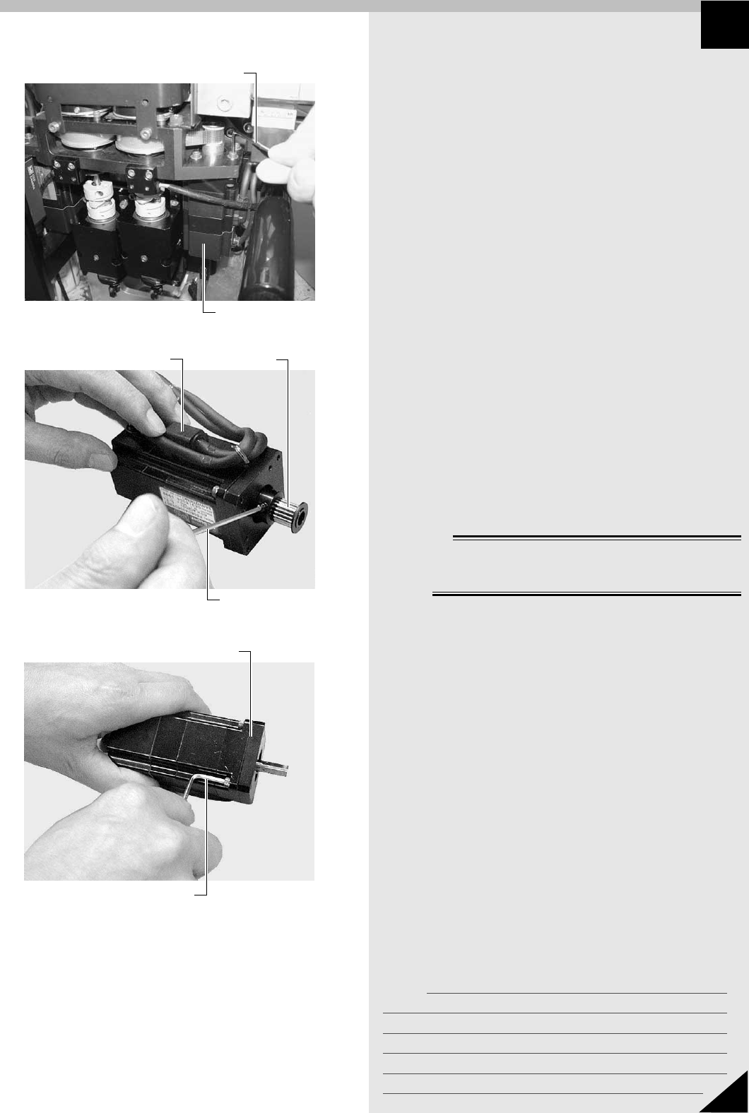メモ 5 5 Section JMC4011102 2. R 軸モーターの交換 5 R 軸モーターを取り外します。 1 . R 軸ベルトのテンション調整を兼ねているボルト 3 本を六角レンチ (2.5) で外します。 2 . R 軸モータープーリーからベルトを外して、モー ターを下から取り出します。 6 R 軸モーターからプーリーを外します。 六角レンチ (1.5) で、 プーリーのセットスクリュー 2 本を外して、プーリーをモーターシ…