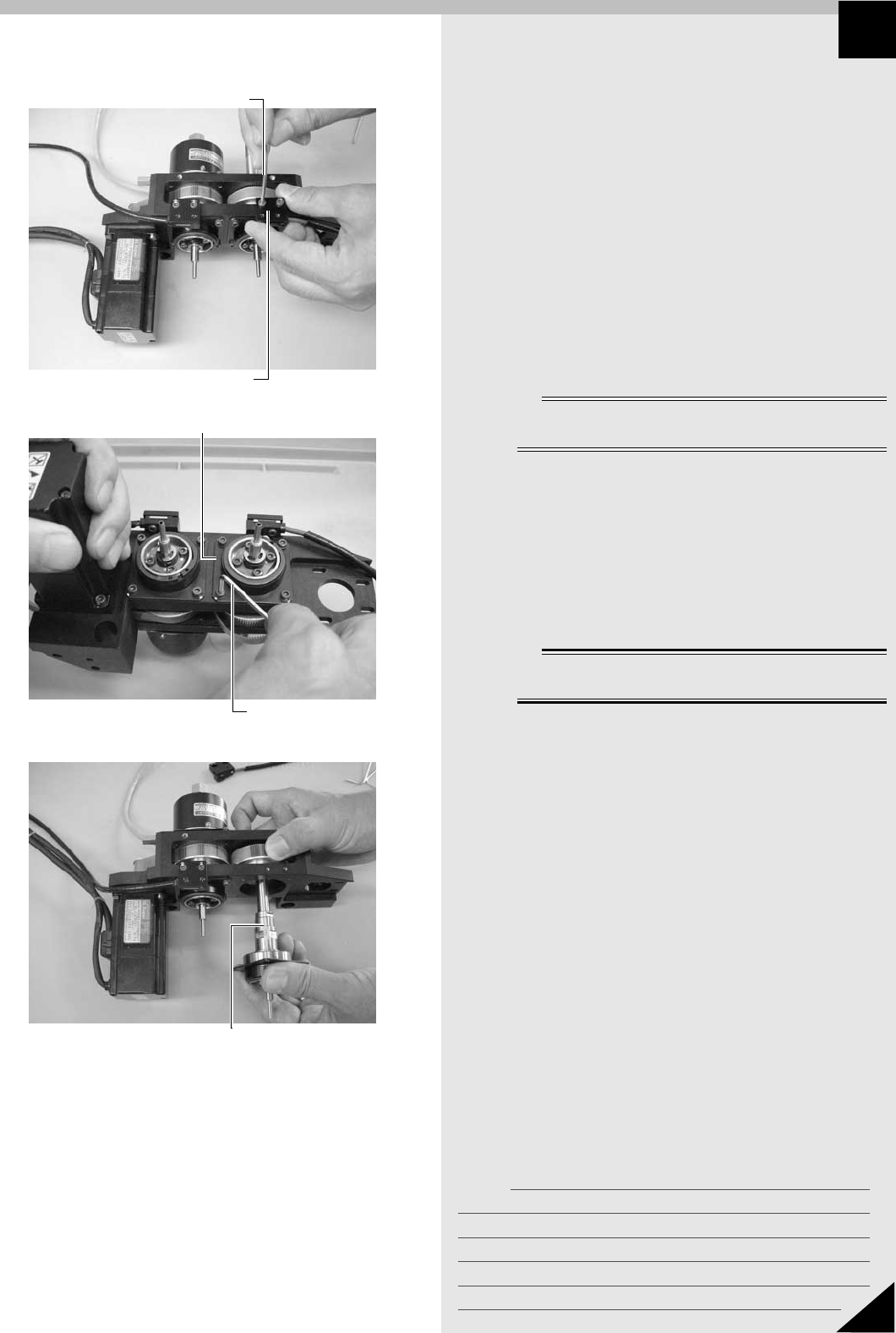メモ 12 5 Section JMC4011102 3. R 軸ベルトの交換 ■ 組立手順 基本的には取り外しと逆の手順で組み立てますが、要点を 以下に述べます。 1 ベアリング押さえ板と R 軸原点センサーを元ど おりに取り付けます。 2 R 軸モーターを組み付けます。 R 軸モーターを外側に引いてベルトのテンションを張 りながら、六角レンチ (2.5) でボルト 4 本を締めて、 モーターを組み付けてください。 3 エンコーダーを…