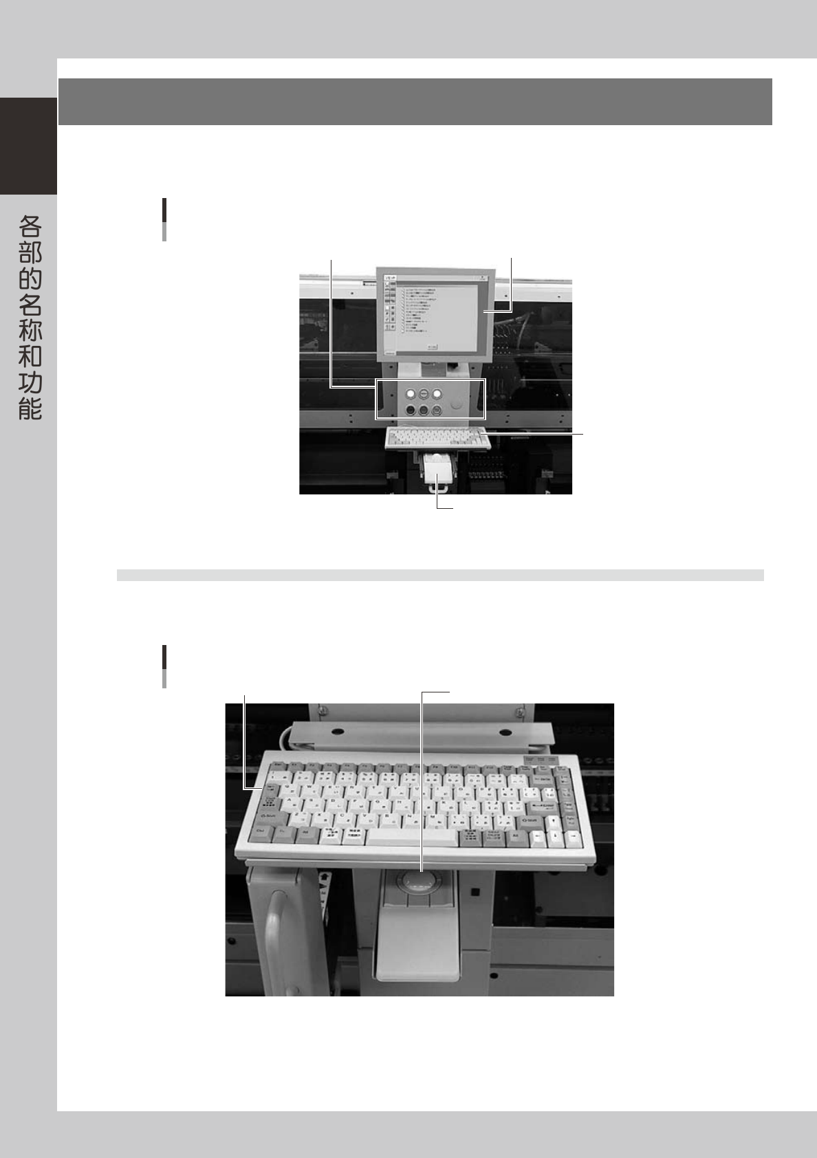 主机的正面和背面 ( 背面的为选项装置 ) 有操作机器、输入数据时使用的操作面板按钮、键盘、轨迹球等装备。