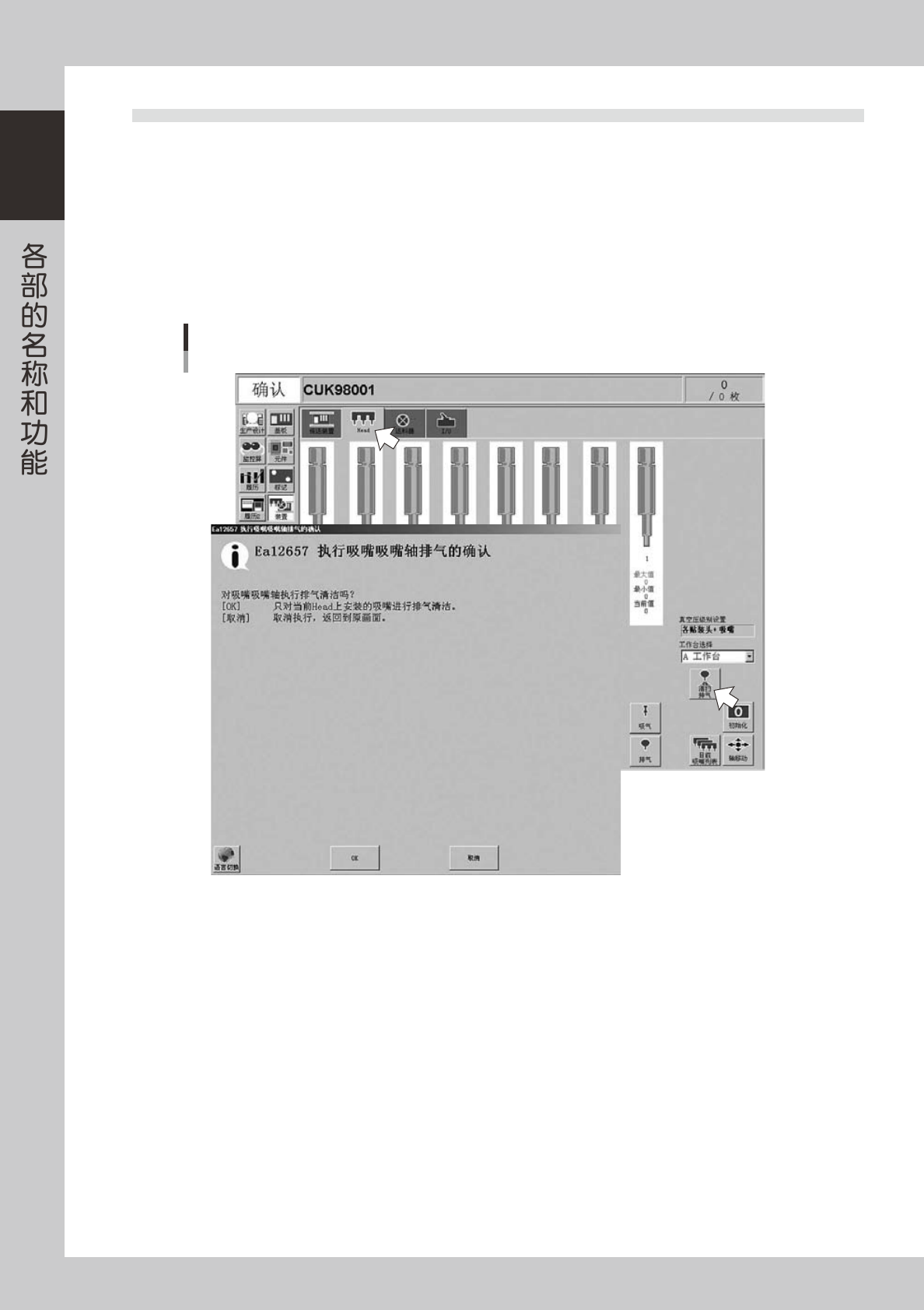 1-20 1 9 . 1 吸 嘴 轴 排 气 的 执 行 方 法 以 下 说 明 在 任 意 时 间 手 动 执 行 吸 嘴 轴 排 气 的 方 法 。 1 打 开 [ 装 置 ] - 「 H e a d 」 选 项 卡 。 2 按 [ 清 扫 排 气 ] 按 钮 。 显 示 「 执 行 吸 嘴 吸 嘴 轴 排 气 的 确 认 」 对 话 框 。 如 需 要 排 气 清 洁 吸 嘴 轴 , 按 [ O K ] 按 钮 , 进 入 下…