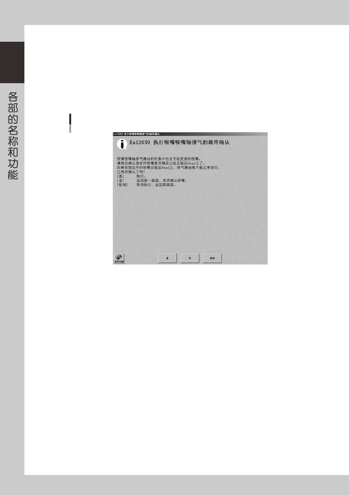 1-22 1 5 显 示 「 执 行 吸 嘴 吸 嘴 轴 排 气 的 最 终 确 认 」 对 话 框 。 确 认 对 话 框 的 内 容 , 按 需 要 执 行 的 按 钮 。 按[ 是 ] 按 钮 对 对 象 吸 嘴 排 气 清 洁 吸 嘴 轴 。 按[ 否 ] 按 钮 返 回 「 与 手 动 更 换 的 吸 嘴 进 行 实 物 对 照 」 对 话 框 。 按[ 取 消 ] 按 钮 取 消 排 气 清 洁 吸 …