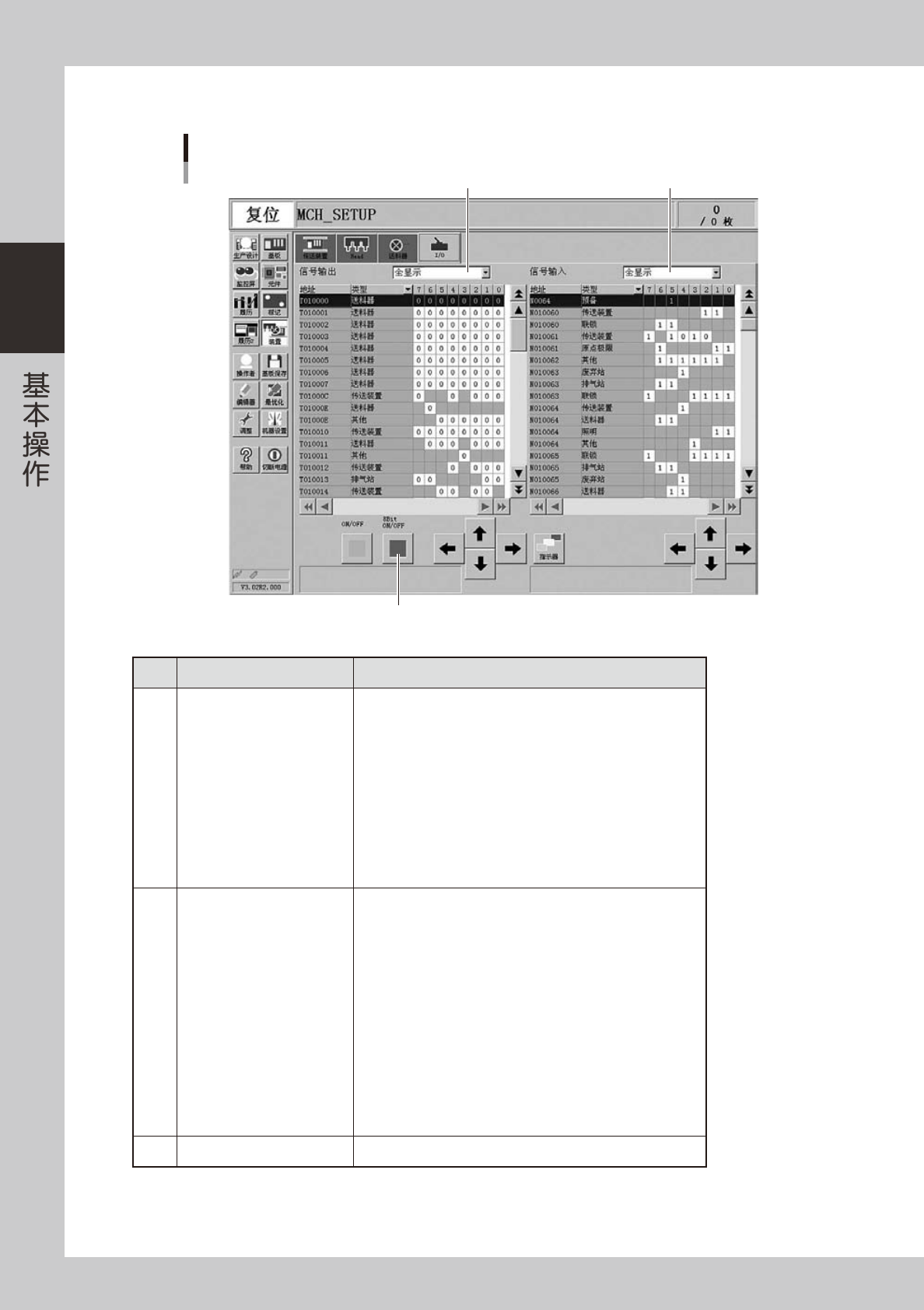 2-18 2 ■ I / O 手 动 操 作 「装置」-「I/O」画面 1 2 3 26 2 1 0- M 3 -0 0 按 钮 名 称 功 能 1 信 号 输 出 侧 显 示 段 切 换 切 换 O u t p u t 侧 所 显 示 段 。 ‧ 送 料 器 ‧ 吸 嘴 交 换 站 ‧ 托 盘 交 换 器 ‧ 照 明 ‧ 传 送 装 置 ‧ H e a d ‧ 蜂 窝 状 托…