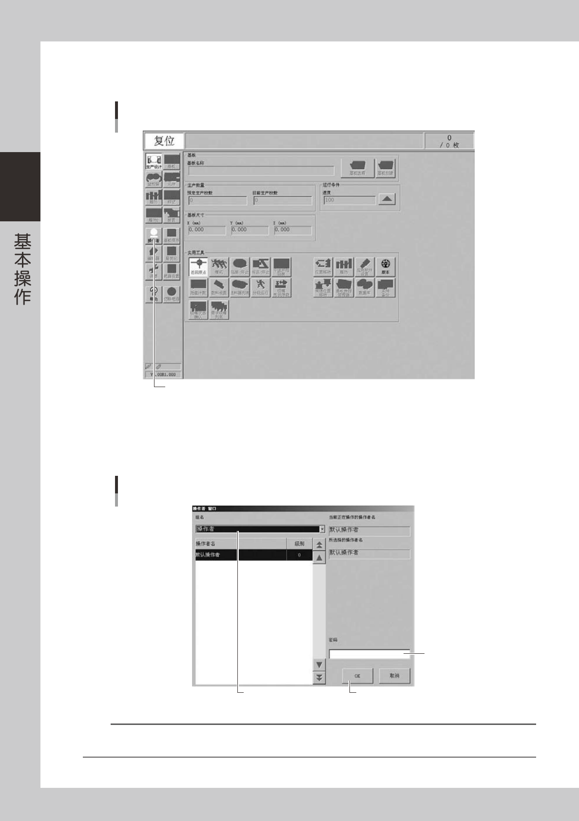2-22 2 3 按 [ 操 作 者 ] 按 钮 。 打 开 指 定 操 作 人 员 的 「 操 作 者 窗 口 」 画 面 。 按[操作者]按钮,打开「操作者窗口」画面 [操作者]按钮 26 2 1 2- M 3 -0 0 4 指 定 操 作 人 员 , 输 入 密 码 。 根 据 需 要 可 以 从 「 组 名 」 目 录 中 选 择 「 管 理 者 」 或 「 维 护 者 」 。 输 入 密 码 后 按 [ O K ] 按 钮 。…