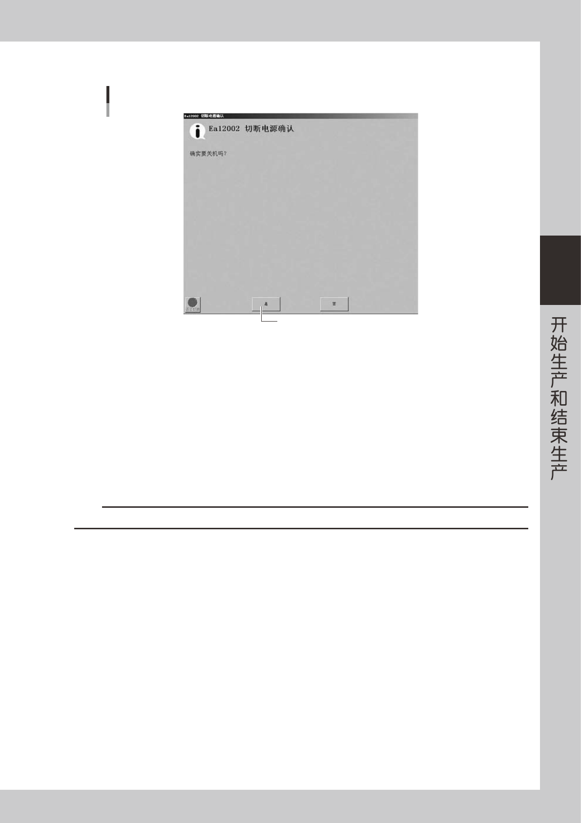 3-7 3 4 确 认 对 话 框 显 示 后, 按 [ 是 ] 按 钮。 按[是]按钮 结束生产的确认对话框 26 3 0 7- M 3 -0 0 5 实 施 向 原 点位 置 的 移动。 原 点 移动 对 话 框 显 示 后, 按 [O K ] 按 钮。 6 切 断电 源 的 确 认 对话 框 显 示 后 , 按 [O K ] 按 钮。 e 7 按 紧 急停 机 按 钮。 紧 急停 机 对 话 框 显 示 后, 按 紧 急停 机 按…