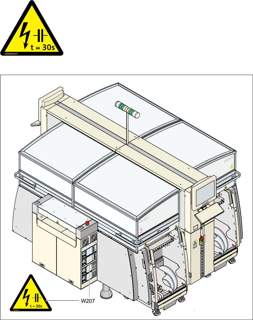 用户手册 SIPLACE HF 2 安全操作 软件版本 SR.504.xx 2003 年 7 月中文版 2.2 警告标签 39 2.2.6 轴单元上的警告标签 W207 2 W207 ,部件号 03009346-01 (每个贴片系统的编号: 1 ) 2 图 2.2 - 9 轴单元 Macrolon 面板上的警告标签 W207 2 位置 W207 ,部件号 030 09346-01 2 2 主电源电压! 关闭主电源开关,等候 30 秒,直…
