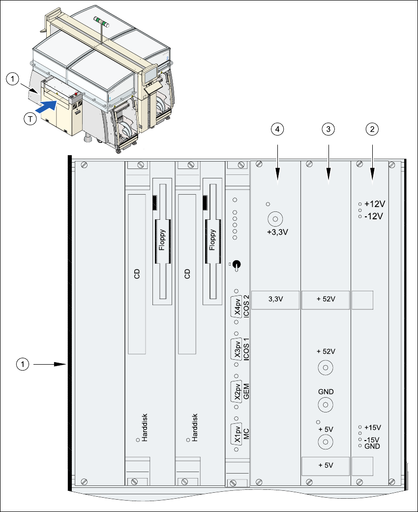 2 安全操作 用户手册 SIPLAC E HF 2.9 关闭主电源开关后贴片机的能量状态 软件版本 SR.504.xx 2003 年 7 月中文版 74 2.9.1 贴片系统在主开关处关闭、但仍与主电源连接… 警告 即使关闭了主电源开关,下列单元 仍带有潜在致命电压: - 主电源开关 Q1 的电缆连接终端 L1 , L3 和 L5 (见图 2.9 - 4 ) - 维护插座 X102 (见图 2.9 - 4 ) - 维护插座的自动断路器 …