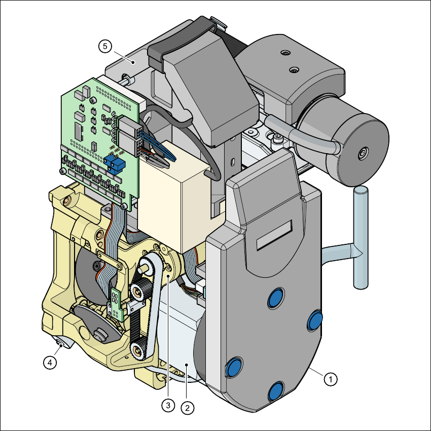3 技术数据 用户手册 SIPLAC E HF 3.3 贴片头 软件版本 SR.504.xx 2003 年 7 月中文版 98 3.3.3 用于高速 IC 贴片的 6 段位器收集贴片头 3 图 3.3 - 5 6 段位器收集贴片头 - 功能组一 3 (1) 真空发生器 (2) DP 马达, DP 轴 (3) 带有 6 个段位器光栅盘的星形轴, DR 轴 (4) 吹气压力阀 (5) 消声 器
