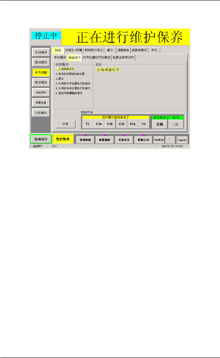 (6) 按动作 [ON] 按钮,在 2 秒钟内按下操作台的 [ENABLE] 按钮。 料车移动到润滑油补给位置,显示如下界面。 Fig.4A85-3 Fig.4A85-3 Fig.4A85-3 Fig.4A85-3 Fig.4A85-3 (7) 按 [ 紧急停止 ] 按钮,打开所有的门。 请向直线导轨滑动块的注油嘴注油。 结束注油后,关闭所有的门。 (8) 解除 [ 紧急停止 ] 按钮的锁定,按 [ 恢复 ] 按钮。 按 [POWER …