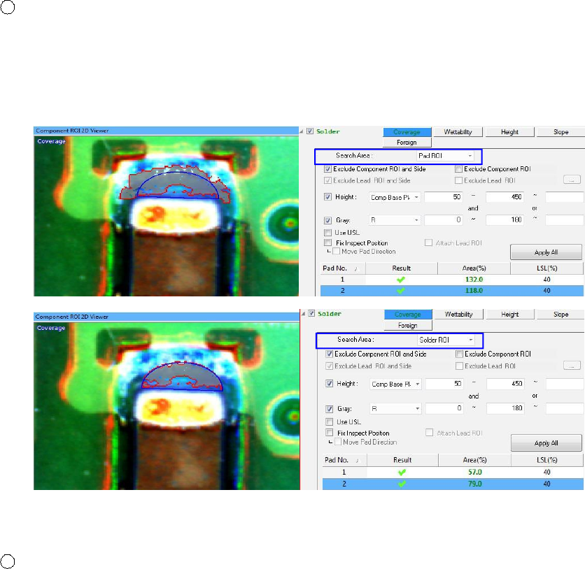 如上图所示, 通过使用 "排除零件 ROI" 选项, 检查焊点的区域将有所不同。因此, 无论是使用