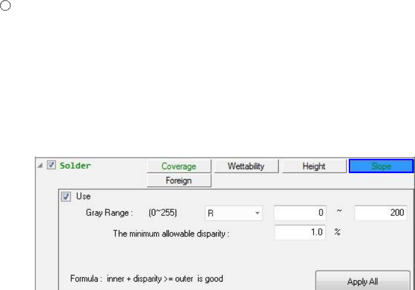 5 对 于 " 固定 检查 位置 " 、 " 移 动 PAD 方向 " 和 " 附加引 线 R OI" 复选 框 , 使用相同算法 与 " 焊 点覆盖 检查 " 操作 , 请参阅 上述 说 明。有一件 事是不同的是 , 在 " 焊 点高度 检查 ", " 焊 料 高 roi 是一 个 目 标 ro i 。 2 。 5 焊点 坡面…