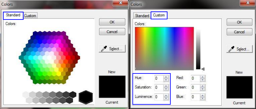 标准" 选项卡上, 用户基本上从 "颜色" 面板中选择颜色。对于颜色变体, 通过 "自定义" 选项