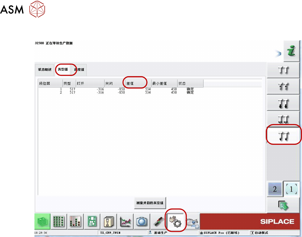 5 贴片头 5.3 双头 144 技术培训 SIPLACE TX系列 01/2018 5.3.4.2 贴片机软件真空检查 ● 如果发生真空错误,则可以使用贴片机软件测试真空系统。 ● 将测出的打开和关闭值之差用作吸嘴检查的参考值。