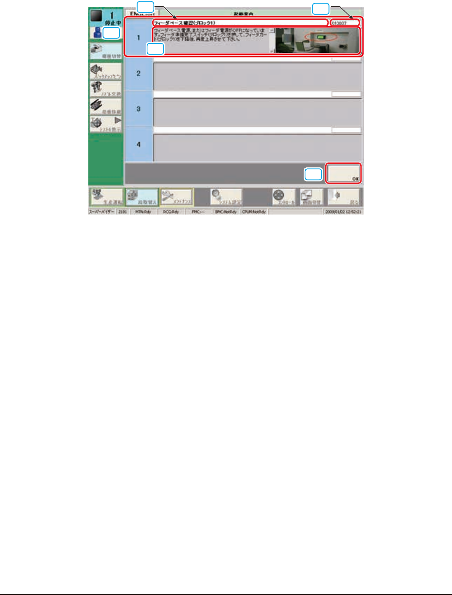 4OM-1839 2-2-1 1603-001 2. 起動案内 2.1 起動案内画面について 装置の操作ミスや異常発生後に正しい復帰をしなかった場合、以下のよう な起動案内画面が表示されます。 [1] [4] [3] [2] [5] 起動案内の例 F4B2 [1] 起動案内 起動案内を表示します。 [2] 起動案内コード 起動案内コードを表示します。 [3] 表示区分 A 起動案内の概要を表示します。 [4] 表示区分 B 起動案内の詳…