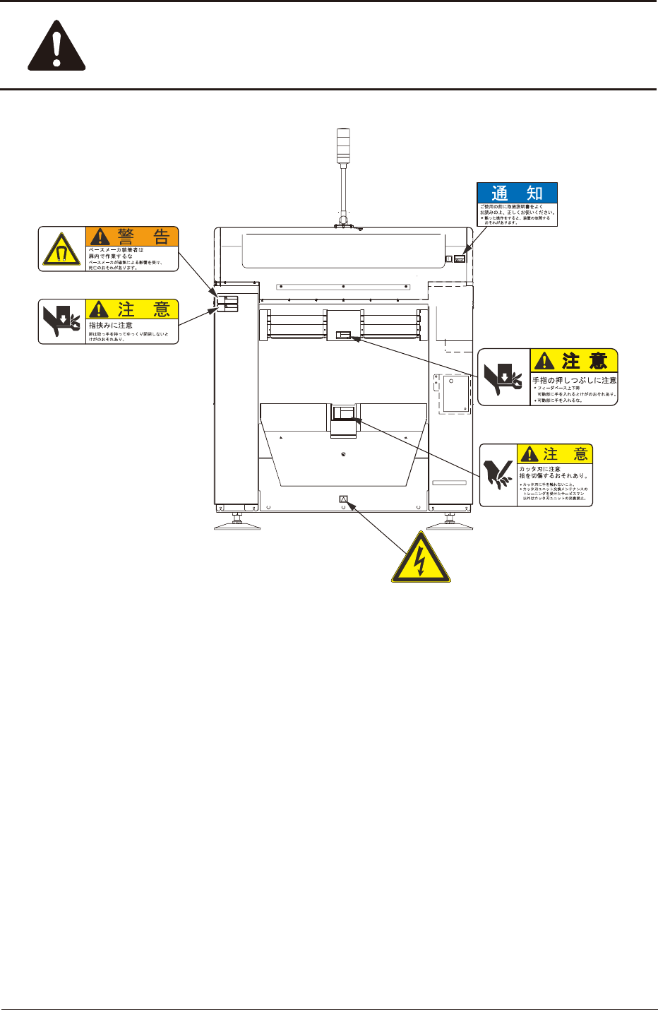 警告ラベルは、危険か所または注意か所に貼付けてあります。