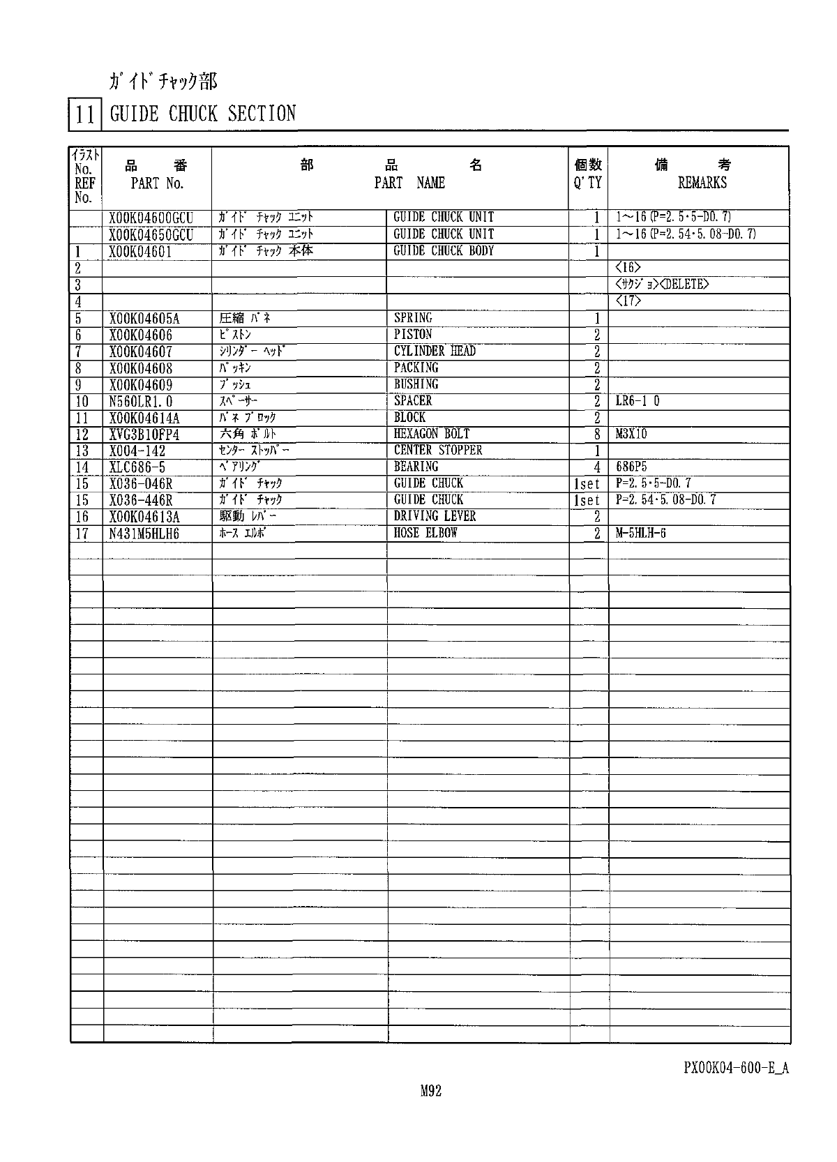 力 , 仆 、 子 ” 夕部 Til GUIDE CHUCK SECTION 考 部 個 数 備 名 品 番 品 No . Q ’ TY REMARKS PART NAME REF PART No . No . r ? F 丽 a 二分 1 ~ 16 ( P = 2.5 - 5 - DO . 7 ) X 00 K 04600 GCU GUIDE CHUCK UNIT 力 , 仆 ’ 于 ” 夕二 7 卜 1 ~ 16 ( P = 2 .…