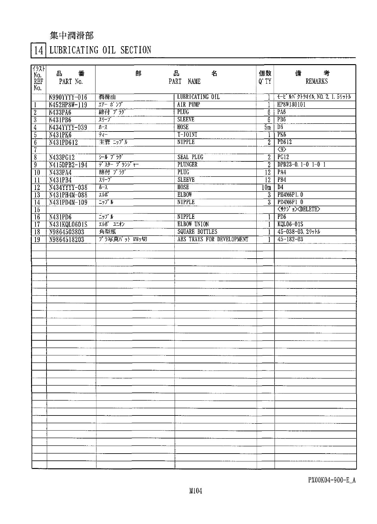 集中潤滑部 HI LUBRICATING OIL SECTION 個数 備 考 部 番 品 名 品 No . PAST NAME Q ' TY REMARKS REF PART No . No . i - f fA * NO . 2 , 1 . N 990 YYYY - 016 1 HM LUBRICATING OIL 17 - > 7 ° HP 8 W 180101 N 452 HP 8 W - 119 AIR PUM…