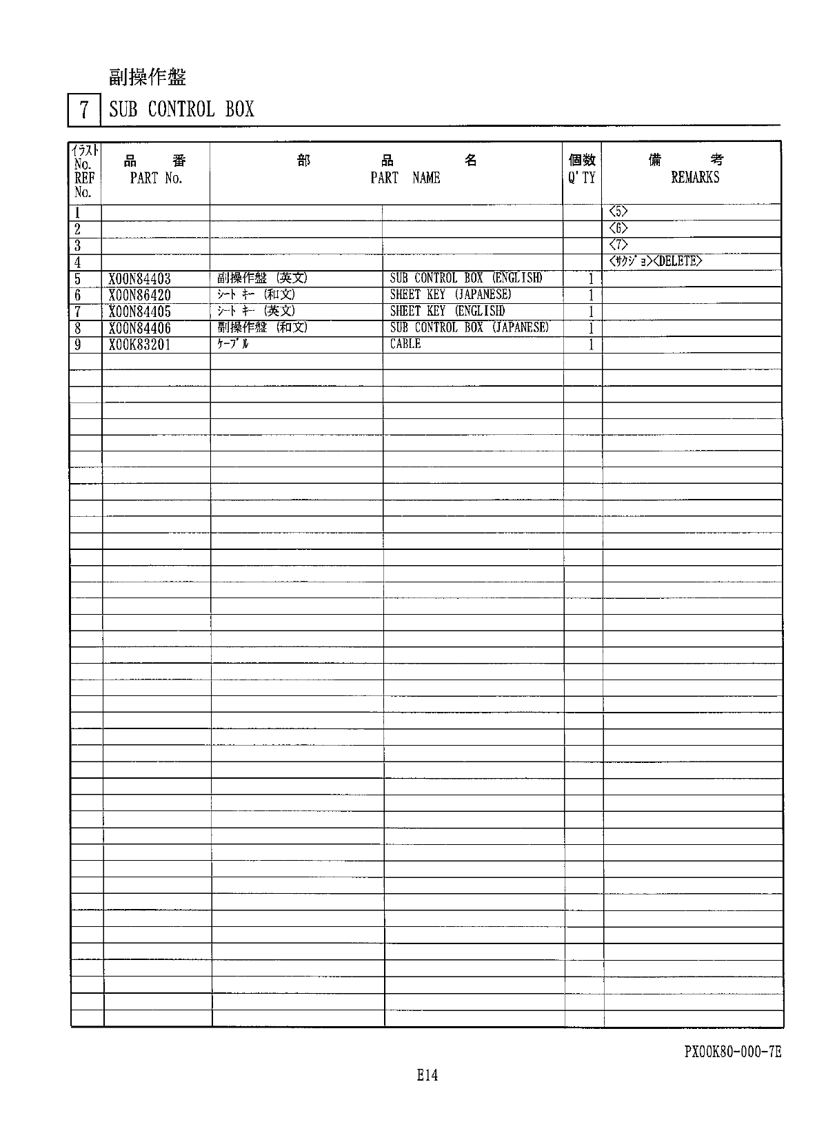 副操作盤 T \ SUB CONTROL BOX 考 個 数 備 部 名 番 品 品 No . Q ' TY REMARKS PART NAME REF PART No . No . < 5 > < 6 > 2 < 7 > I < m ' 3 > < DELETE > 4 副操作盤 ( 英文 ) SUB CONTROL BOX ( ENGLISH ) X 0…