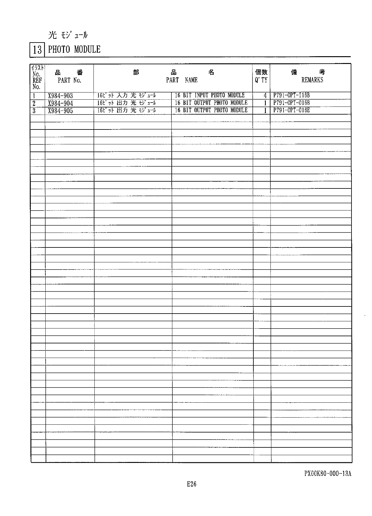 光 壬 m n \ PHOTO MODULE 考 部 名 個 数 備 品 番 品 No . Q ' TY REMARKS PART No . PART NAME REF No . I 6 f WJJTWWT ^ 16 BIT INPUT PHOTO MODULE P 791 - OPT - I 16 B 4 X 984 - 903 16 f 71 - 出 力 光 i : / a - A 16 BIT OUTPUT PHOTO …