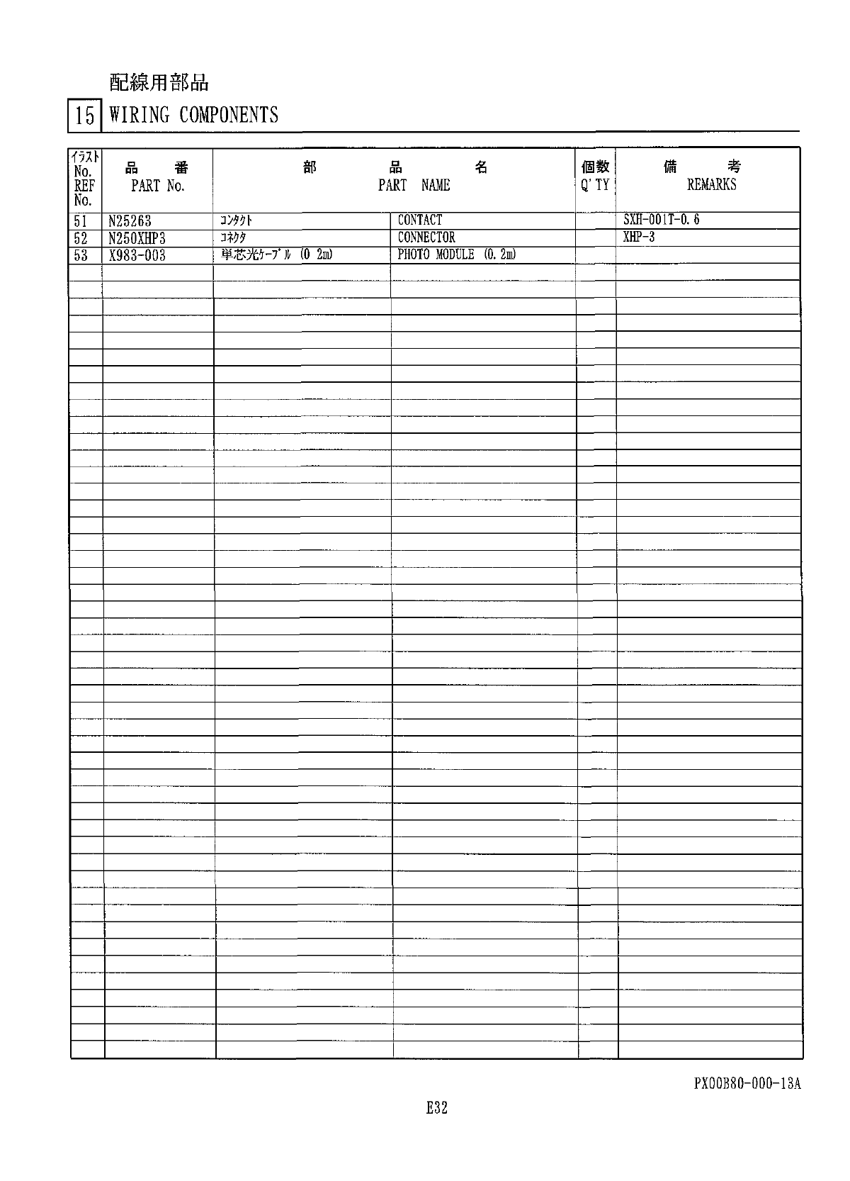 配線用部品 l 5 l WIRING COMPONENTS 倒 考 個 数 備 部 品 名 番 品 No . REMARKS PART NAME Q ' TY REF PART No . No . SXH - 001 T - 0.6 CONTACT MM 卜 51 丽 CONNECTOR N 250 XHP 3 単芯光 ( 0 2 m ) PHOTO MODULE ( 0.2 m ) X 983 - 003 PX 00 B 8…