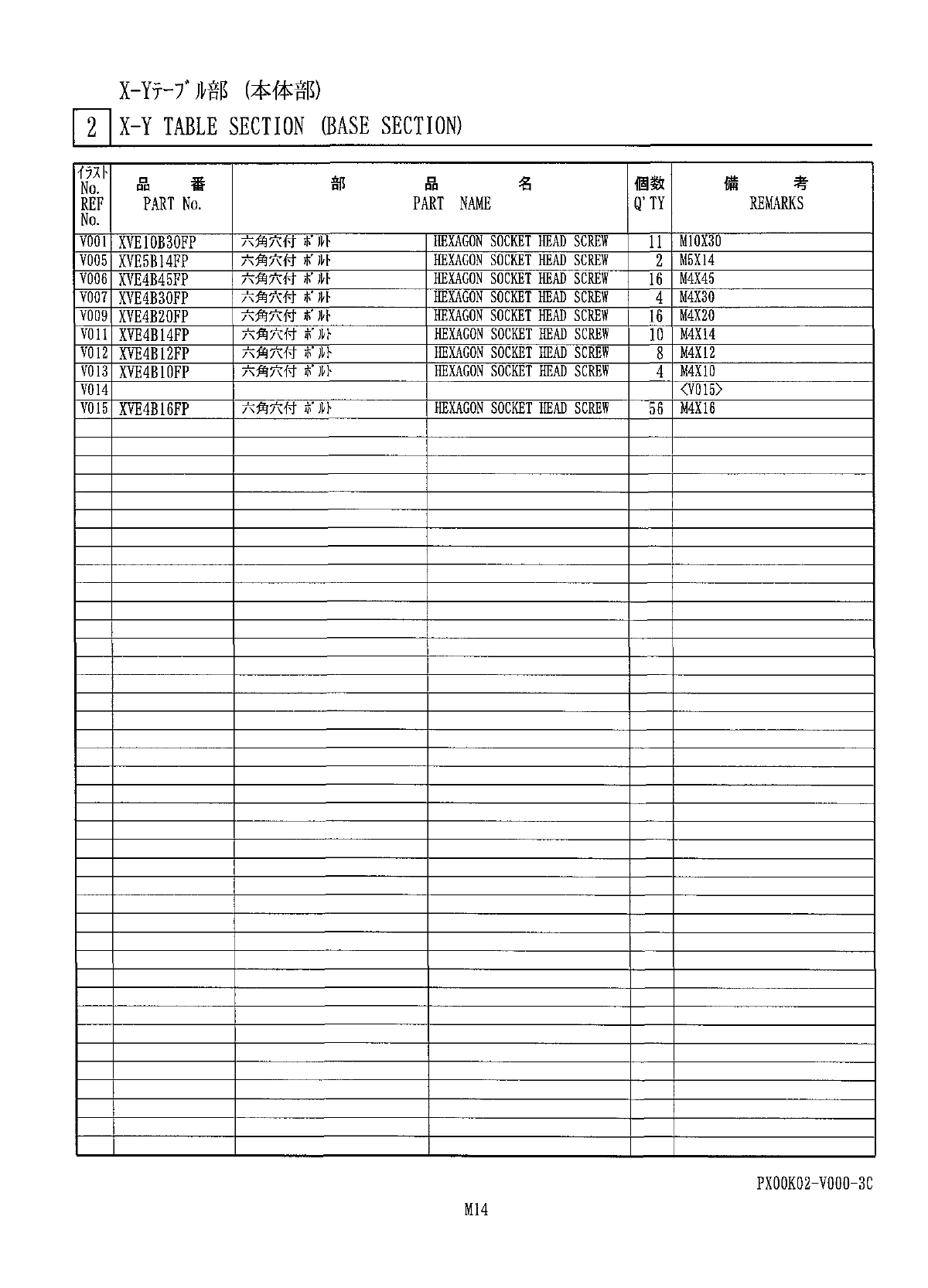 X - Yh / A 部 ( 本体部 ) n X - Y TABLE SECTION ( BASE SECTION ) 部 個 数 備 考 名 番 品 品 No . PART NAME Q ’ TY REMARKS REF PART No . No . M 10 X 30 V O O T XVE 10 B 30 FP 六角穴付 m HEXAGON SOCKET HEAD SCREW 1 1 六 角 穴 付 扩 針 HEXAGON SOC…