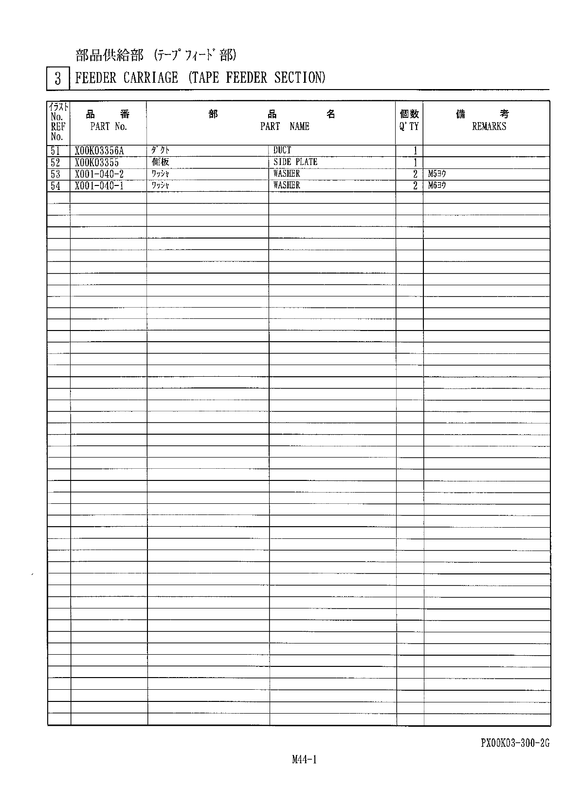 部 品 供 給 部 ( f - 7 ° 7 彳 咅 0 J ] FEEDER CARRIAGE ( TAPE FEEDER SECTION ) ! PX 00 K 03 - 300 - 2 G