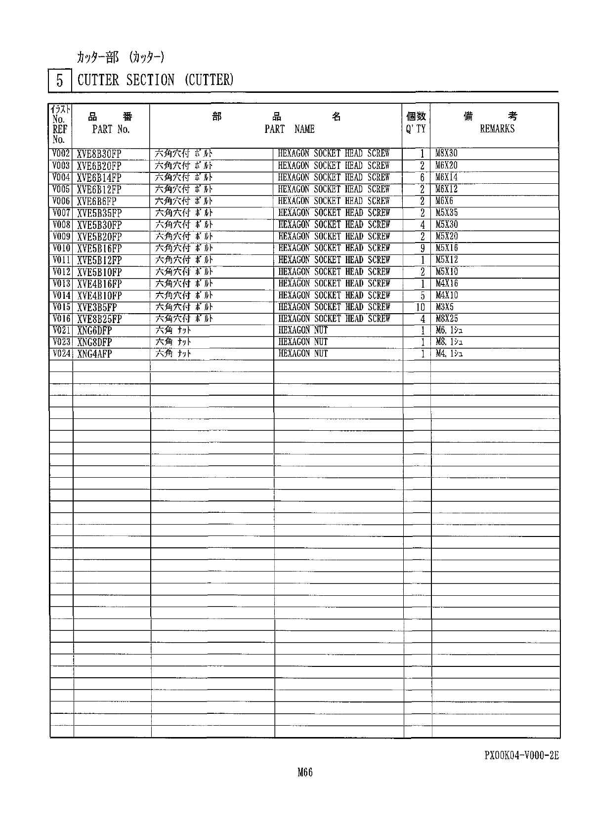 力 7 夕 - 部 ( 力 7 夕 - ) n CUTTER SECTION ( CUTTER ) 個 数 備 考 部 番 品 名 品 No . REMARKS Q ’ TY REF PART No . PART NAME No . V 002 XVE 8 B 30 FP 六 角 穴 付 东 於 HEXAGON SOCKET HEAD SCREW M 8 X 30 六角穴付 f 於 2 M 6 X 20 V 003 HEXAGON SO…
