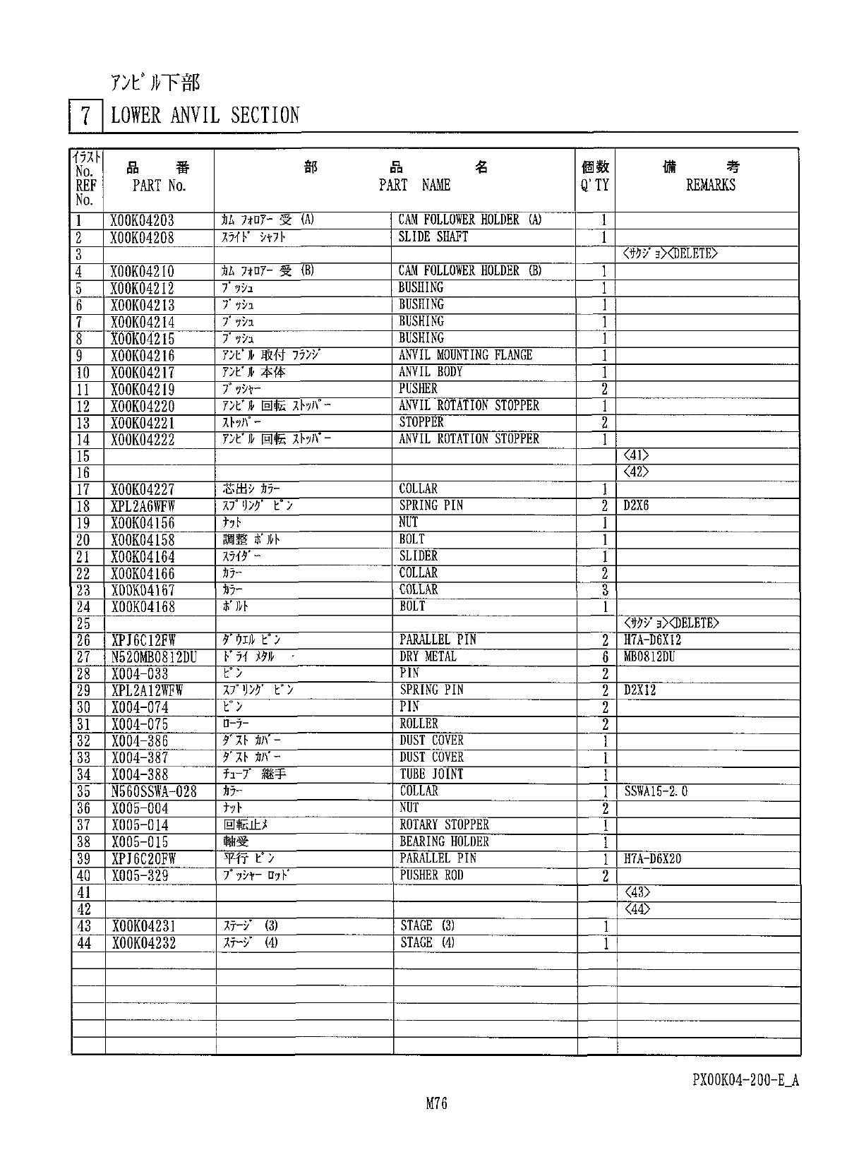 7 > t ' ' A 下部 71 LOWER ANVIL SECTION S 卜 部 個 数 備 考 名 番 品 品 PART NAME Q ’ TY REMARKS REF PART No . No . 力 A 7 扣 7 - 受 ( A [ CAM FOLLOWER HOLDER ( A ) X 00 K 04203 SLIDE SHAFT 2 XO 0 KO 42 O 8 < W / 3 >…