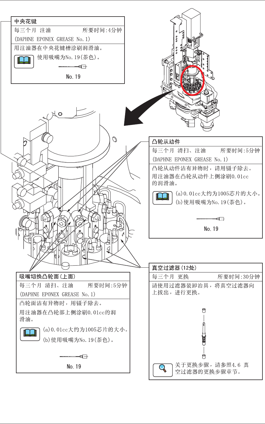 1-33 吸嘴 每三个月 点检 请点检吸嘴的状态,吸嘴顶端磨损时,请进行更换。 吸嘴 毎周 清扫 请用镜头布清扫吸嘴锥形部。 通过界面操作请将吸嘴收存到吸嘴储料器内,取 出各吸嘴储料器后,进行吹气,去除垃圾等。 (a) 请不要用手从安装头取出吸嘴。 否则吸嘴和吸嘴数据不相符。 (b) 吸嘴上的污垢明显或真空吸引力 变弱,吸取或贴装发生不良情况 时,请用水中的超声波清洗。 严禁使用水洗之外的方法。 (a) 关于清扫的详细内容,请参…