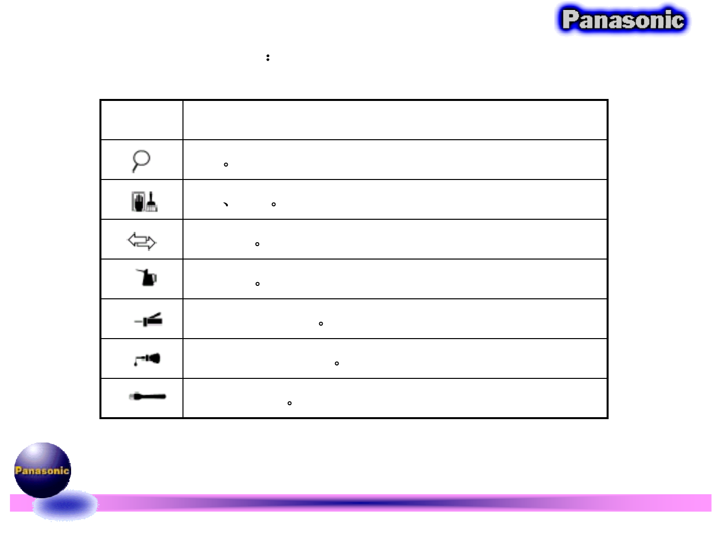 保养手顺中各符号的 含义 使用毛刷注油 使用注油器加 润滑油 使用注 油器加油脂 换润滑剂 交换部 品 打扫 清理 确认 含义 符号