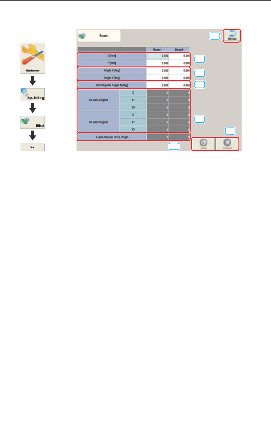 3OM-1842 2-26 1303-001 2.4 Schermata "Beam" [1] [2] [3] [6] [7] [4] [5] F3B26 [1] X (Orizzontale) e Y (V erticale) [mm] I parametri impostati sono utilizzati per regolare la deviazione di posizione in base alle…