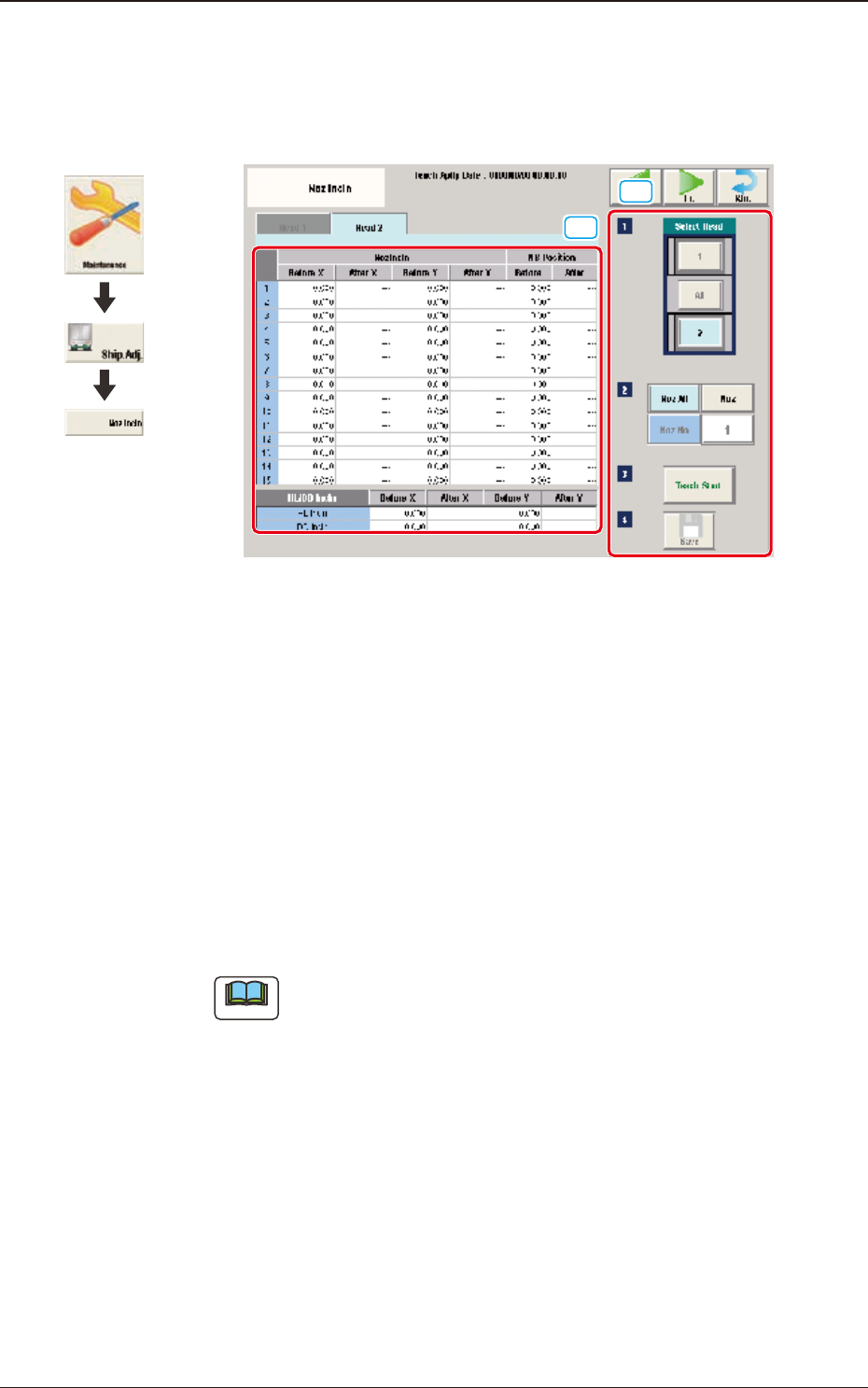 3OM-1842 1-62 1303-001 5.14 Schermata "Noz Incln" In questa schermata è eseguito l’apprendimento dei dati di compensazione per correggere l'inclinazione della testina ugello. [1] [2] F3A45 [1] Sezione visu…