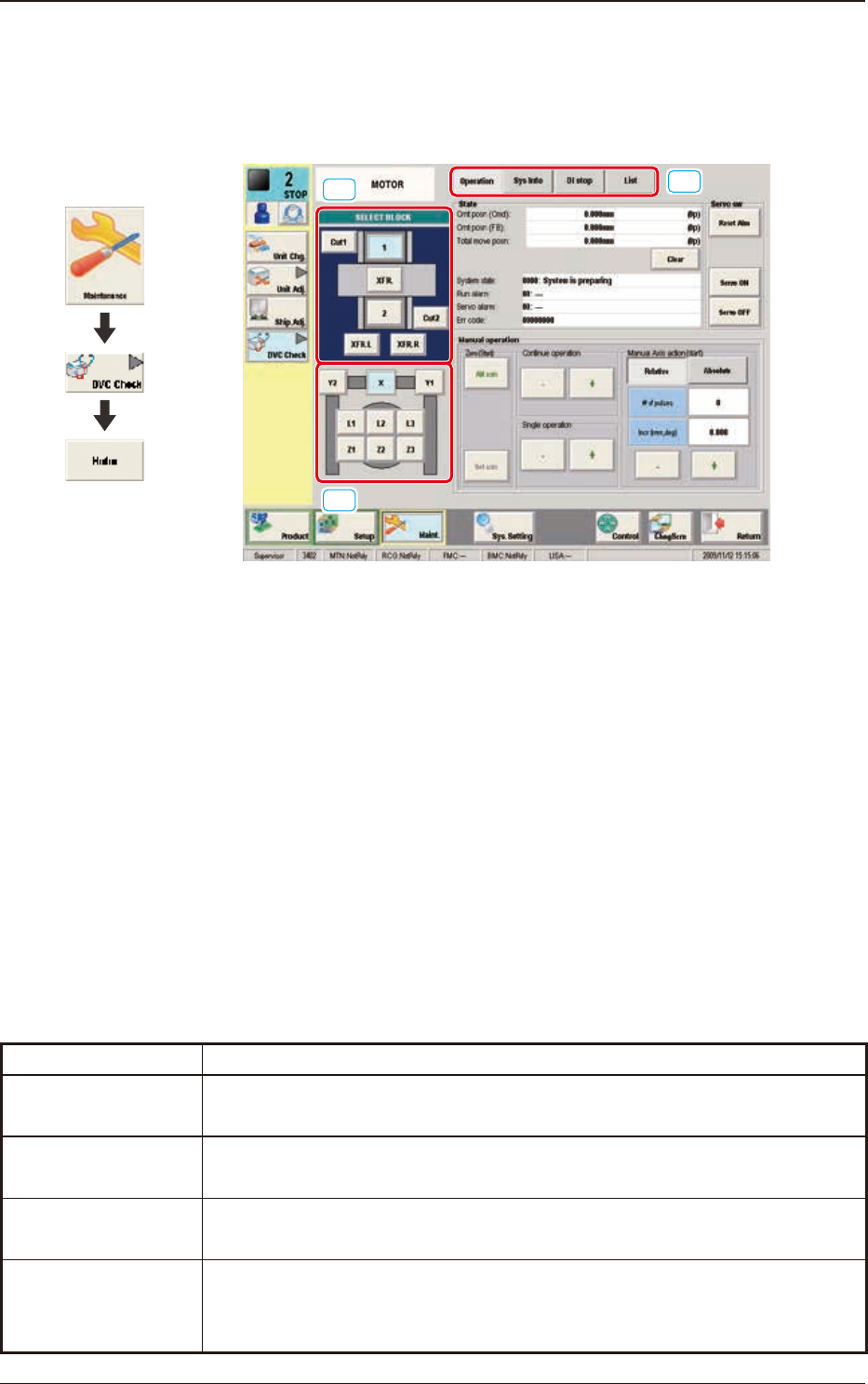 3OM-1842 1-77 1303-001 6.2.1 Schermata "Operation" Questa schermata permette di eseguire un'operazione manuale (velocità ridotta) su ciascuna unità. Quando nella schermata "MOTOR" è premuto il ta…