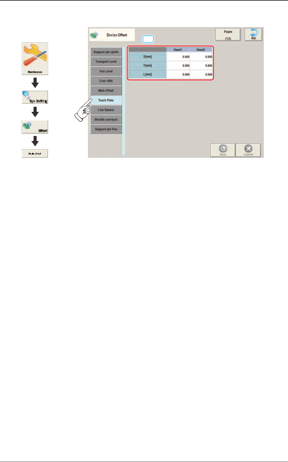 3OM-1842 2-1 1 1303-001 2.1.6 Scheda "T each Plate" [1] F3B1 1 [1] Head 1 and Head 2 X (Orizzontale), Y (V erticale), e L (Altezza) [mm] Inserire i parametri necessari per regolare le deviazioni in base alla po…