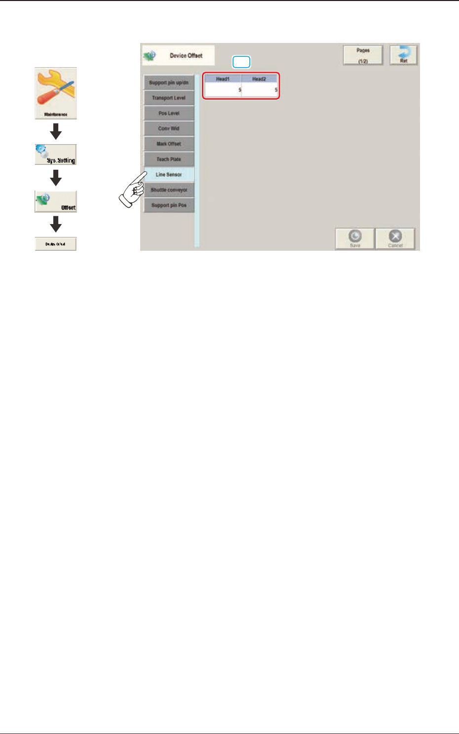 3OM-1842 2-13 1303-001 2.1.8 Scheda "Shuttle conveyor" F3B13 Note Questa impostazione è utilizzata come opzione. Grafica dello svolgimento 2.1 Schermata "Device Offset"