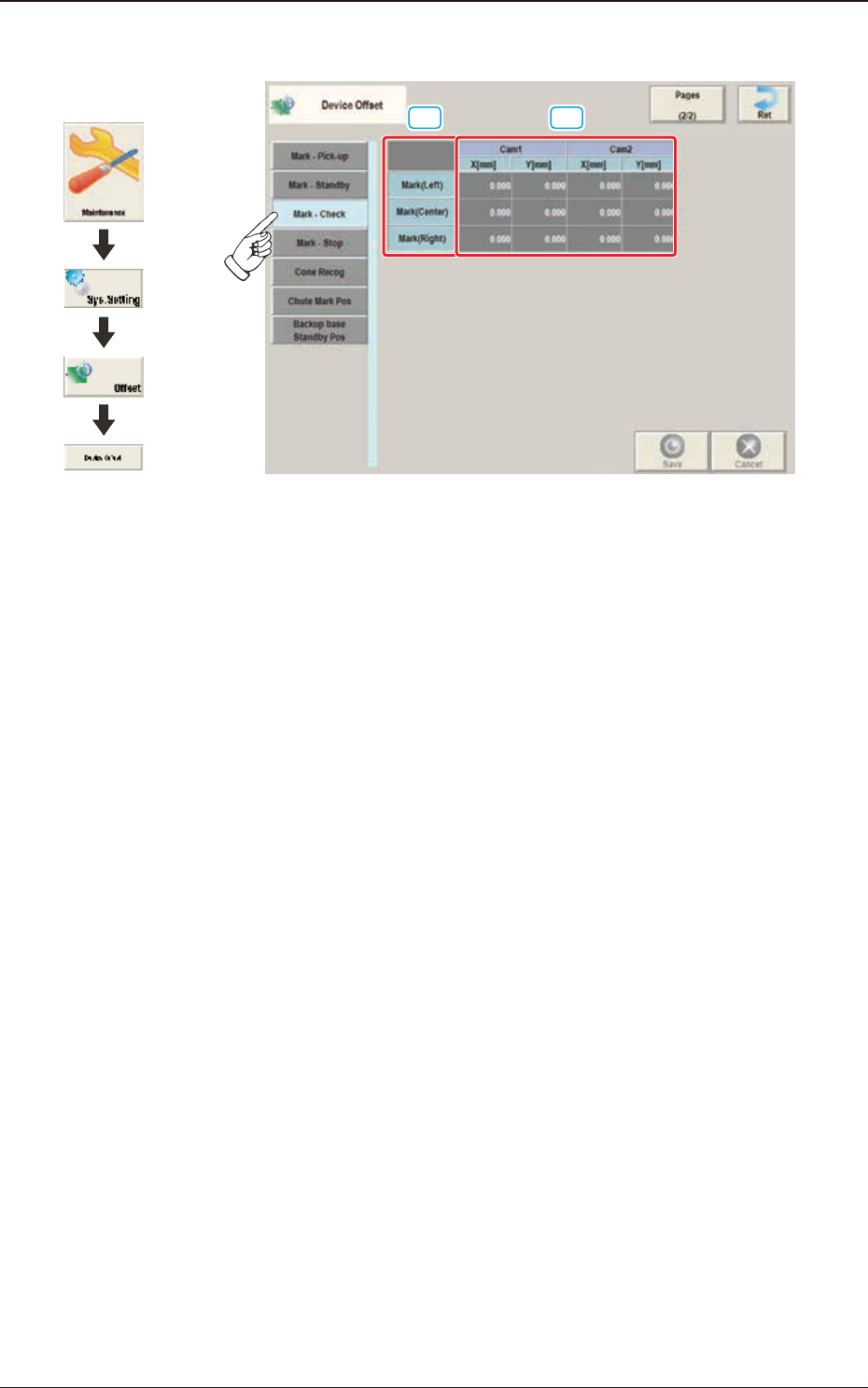 3OM-1842 2-17 1303-001 2.1 Schermata "Device Offset" 2.1.12 Scheda "Mark-Check" [1] [2] F3B17 [1] Mark In queste caselle è visualizzata la posizione di riferimento della marcatura. [2] Cam 1, 2 X [mm]…