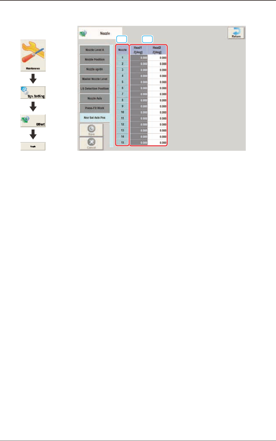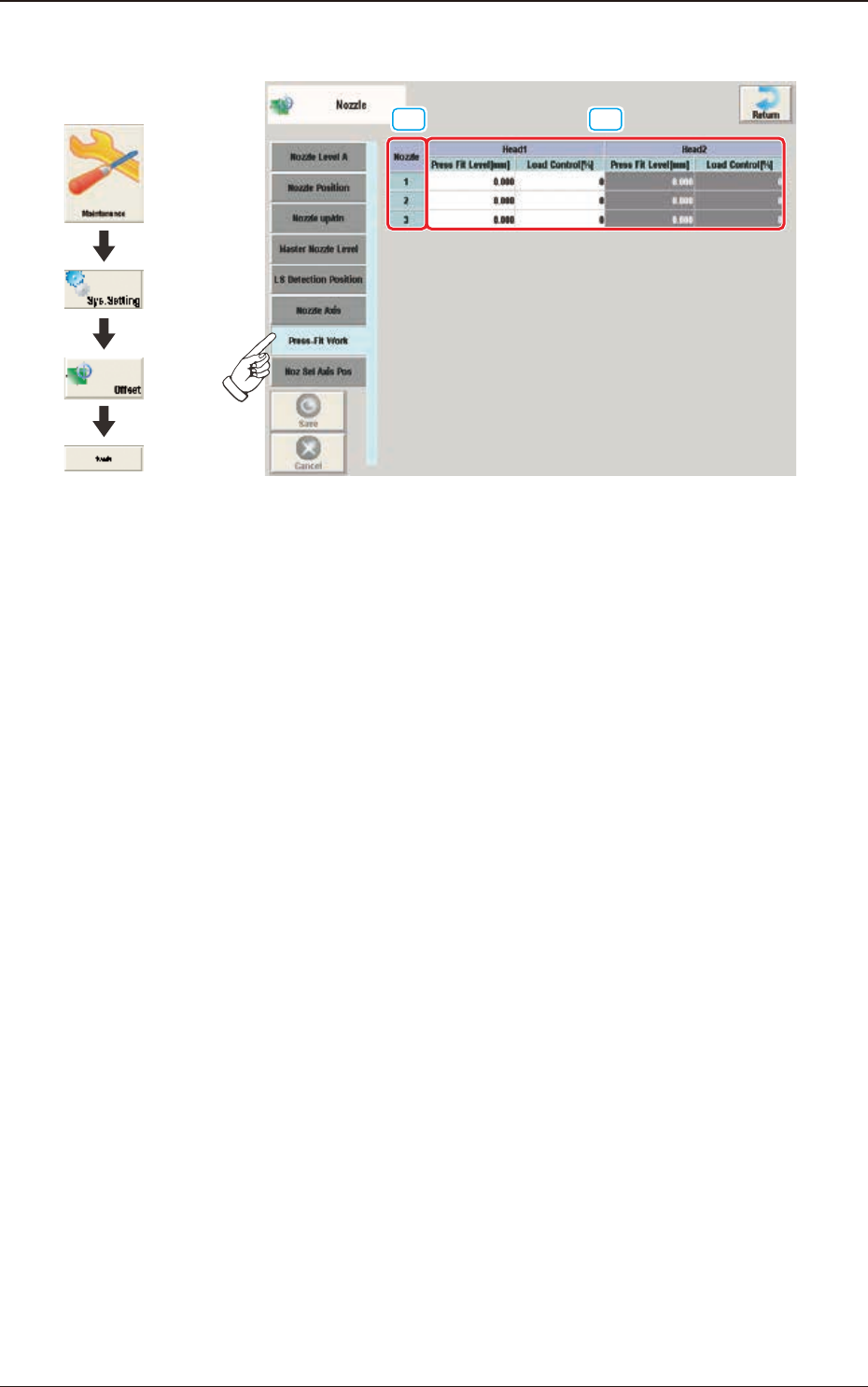 3OM-1842 2-55 1303-001 2.6.7 Scheda "Press-Fit Work" [1] [2] F3B54 [1] Nozzle In questa sezione è visualizzato ciascun numero di ugello. [2] Head 1 e Head 2 Press Fit Level [mm] In queste caselle è eseguita la …
