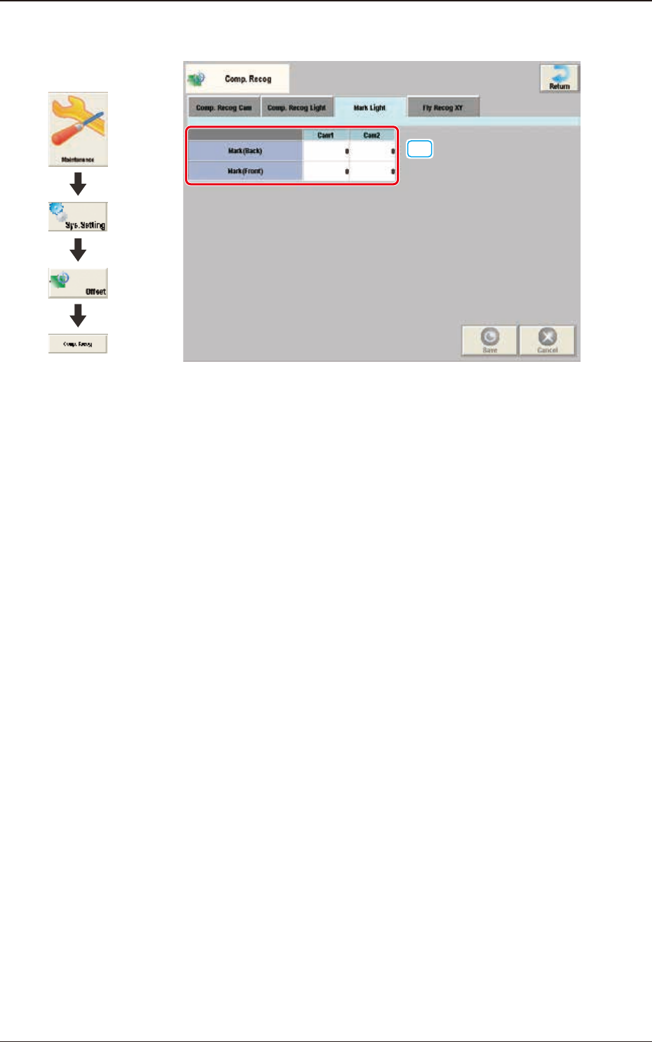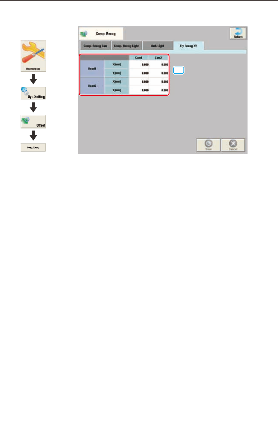 3OM-1842 2-68 1303-001 2.9.4 Scheda "Fly Recog XY" [1] F3B67 [1] Head 1, Head 2 X [mm], Y [mm] Cam1 e Cam2 Permette di ottenere le deviazioni (causate principalmente dal ritardo del servoamplicatore e della lu…