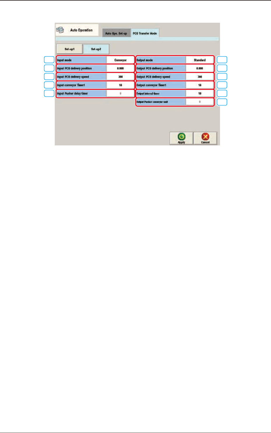 3OM-1842 2-84 1303-001 3.2 Scheda "PCB T ransfer Mode" [4] Input conveyor T imer1 [sec] Permette di impostare l’intervallo per limitare il tempo di funzionamento (ricezione PCB dalla macchina di ingresso) del c…