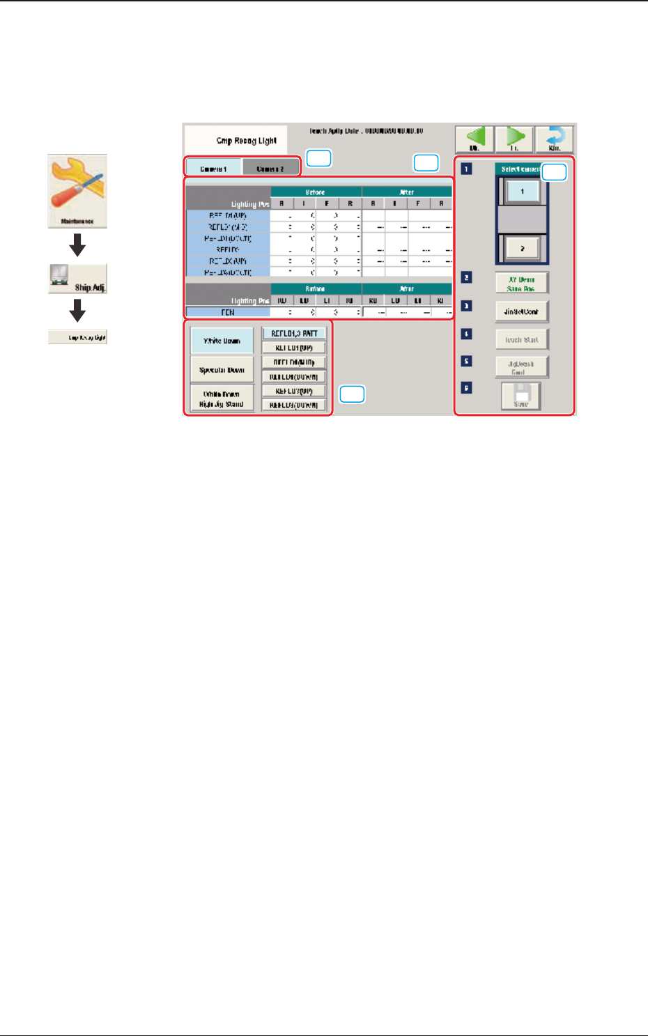 3OM-1842 1-37 1303-001 5.4 Schermata "Cmp Recog Light" [4] Area di visualizzazione procedura di apprendimento Sono visualizzati i tasti da utilizzare per l’apprendimento. Select camera Ciascuna telecamera nell&…