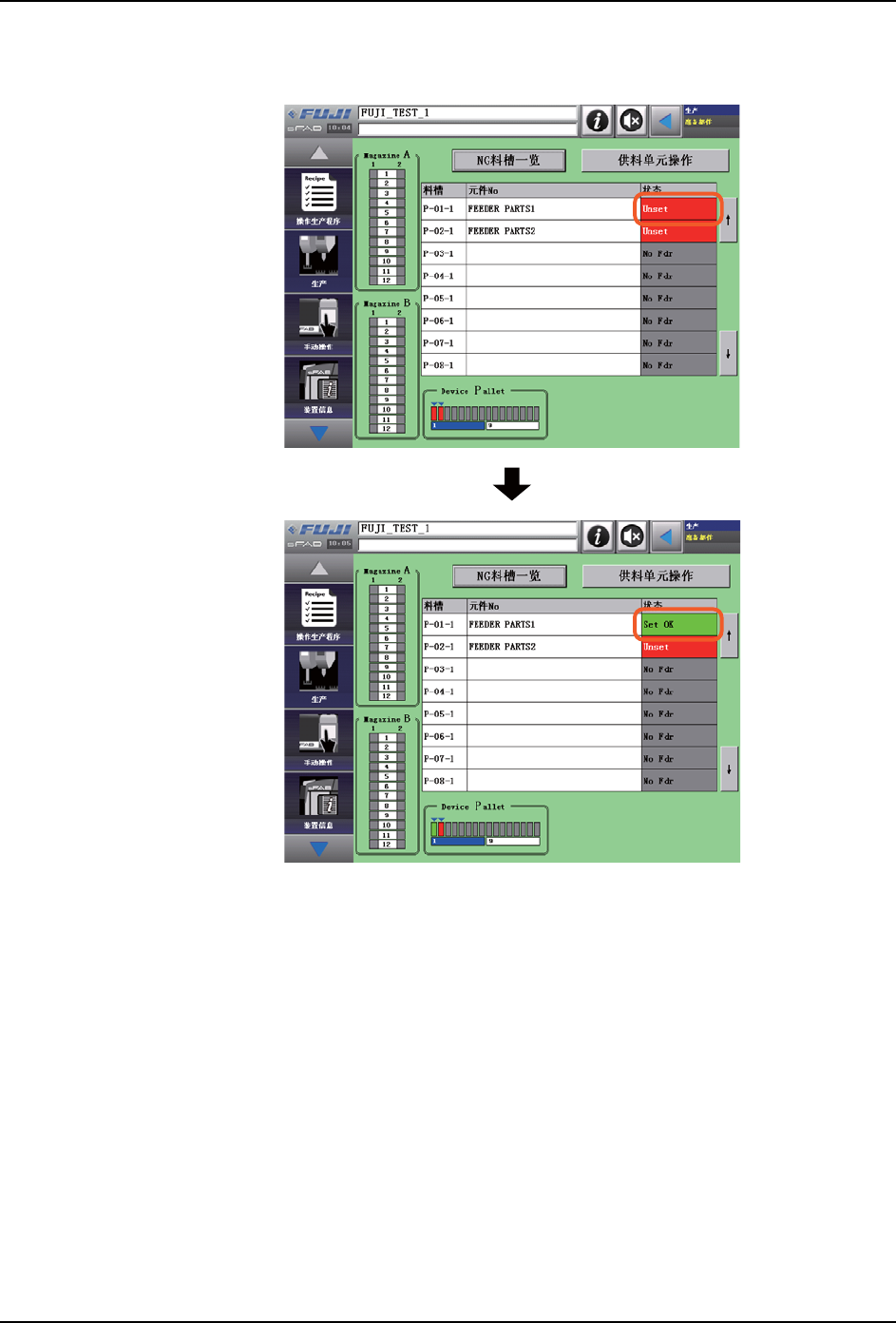 OPE-SFAB-005S0 6. 如何换线 SmartFAB 操作手册 93 6.6.4 如何补充供料器元件 (使用 Fujitrax 验证功能) 1. 在准备部件画面上,通 过 [↑]/ [↓]的操作 ,显示供料器供料群 组 (Device Pallet) ,确认需要补充的料槽状态。 备注 )状态栏中所显示的状态详细内容,请参照 「10.1 供料单元 状态的种类和含义」 。 2. 对已安装的供料器进行补充时,请参考 「6.6.2 如…