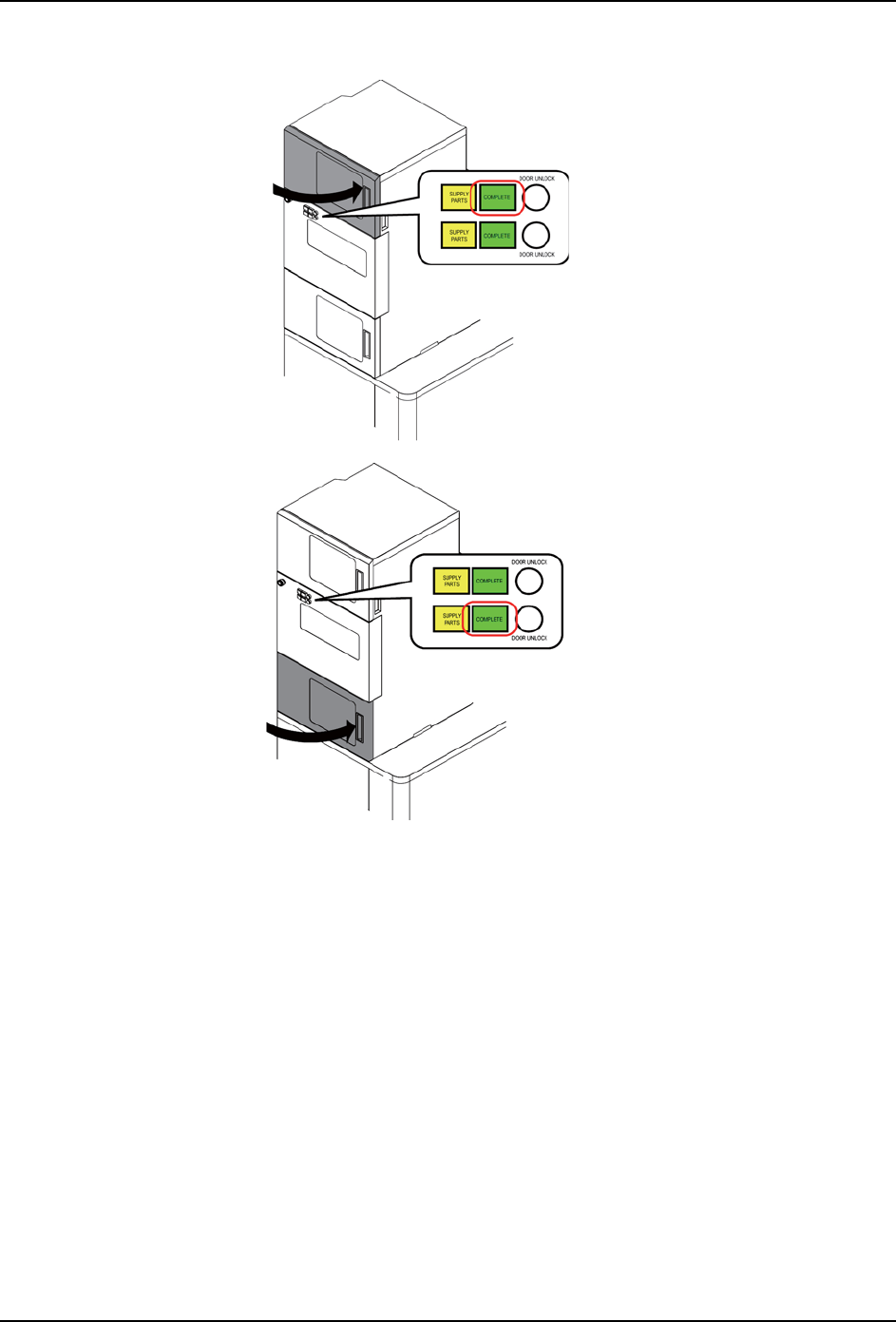 17. 关闭料盘箱门后,COMPLETE 键就会开始闪烁。为了结束补料请按动 COMPLETE 键。