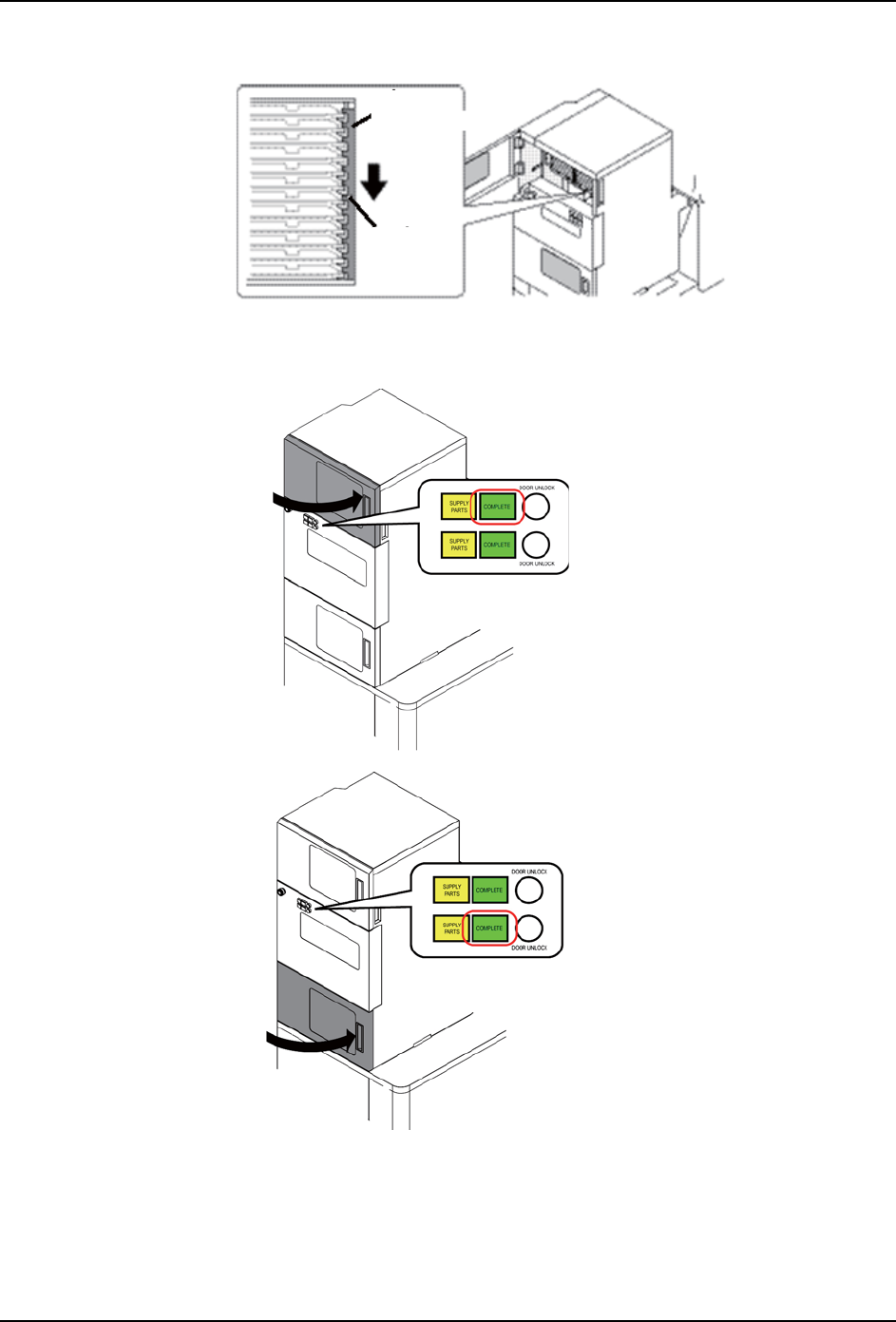 13. 关闭料盘箱门后,COMPLETE 键就会开始闪烁。为了结束补料请按动 COMPLETE 键。