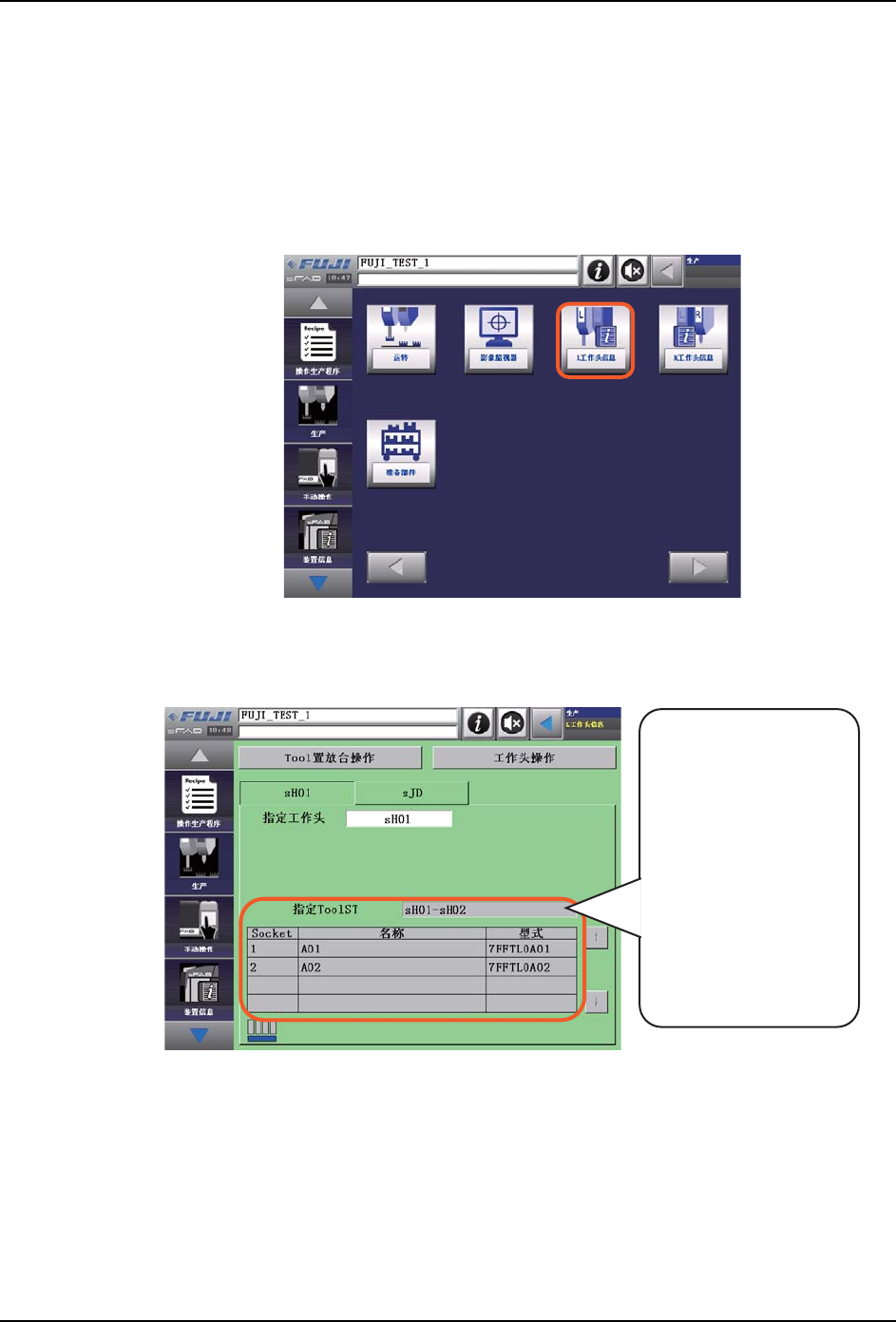 2. 在 L 工作头信息画面上,显示 Tool 置放台名和 Tool 名的生产程序信息。以表的背景色