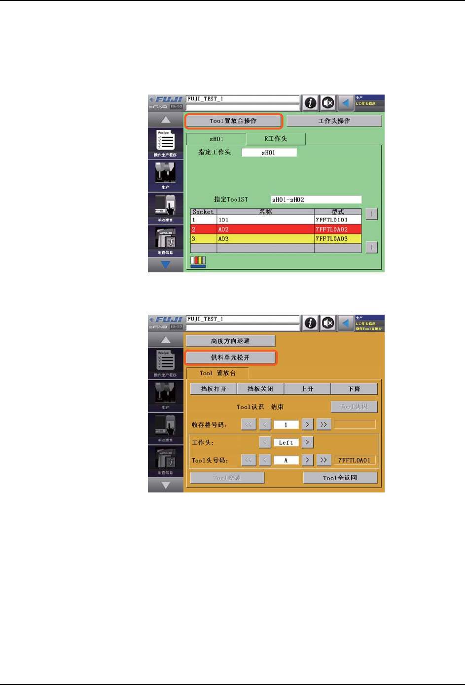OPE-SFAB-005S0 6. 如何换线 SmartFAB 操作手册 115 6.8.3 如何更换 Tool 置放台 说明通过手动操作更换置放台的 步骤。在更换步骤中,进行供料单 元的卸下和安装。 1. 在 L 工作头信息画面上,请按下 [Tool 置放台操 作]按钮。显示操控 Tool 置放台的画 面。 2. 卸下供料单元。请按下 [供料单元松开] 。 备注 )为了方便 Tool 置放台卸下作业, 必要时, 请按下 [高度方向退避…