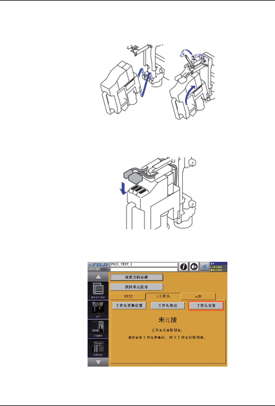 4. 关闭安全门,在 L 工作头操作画面上,按下 [工作头安装]按钮。工作头的供料电源被