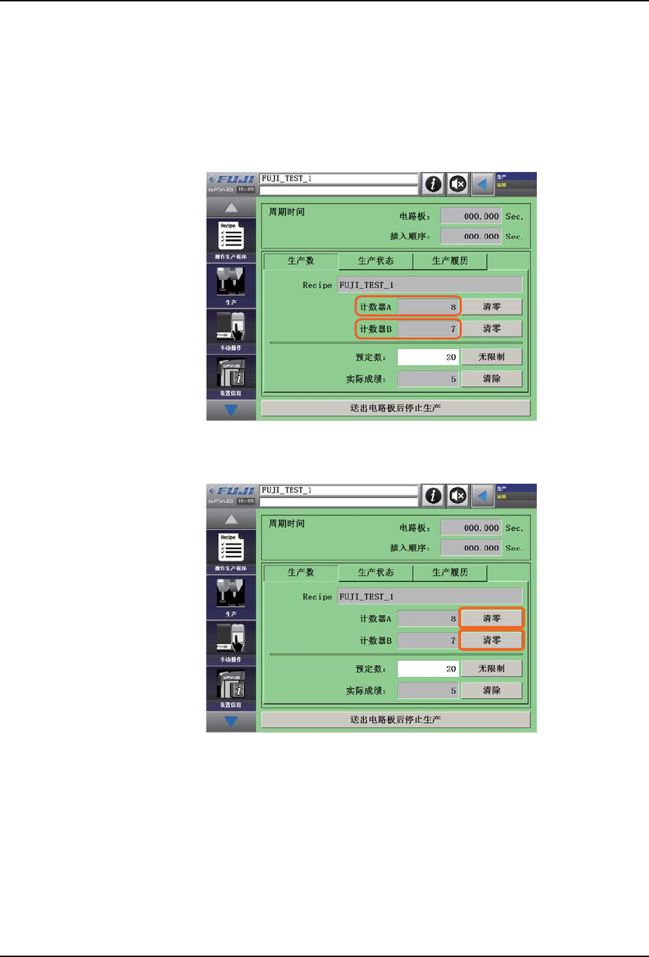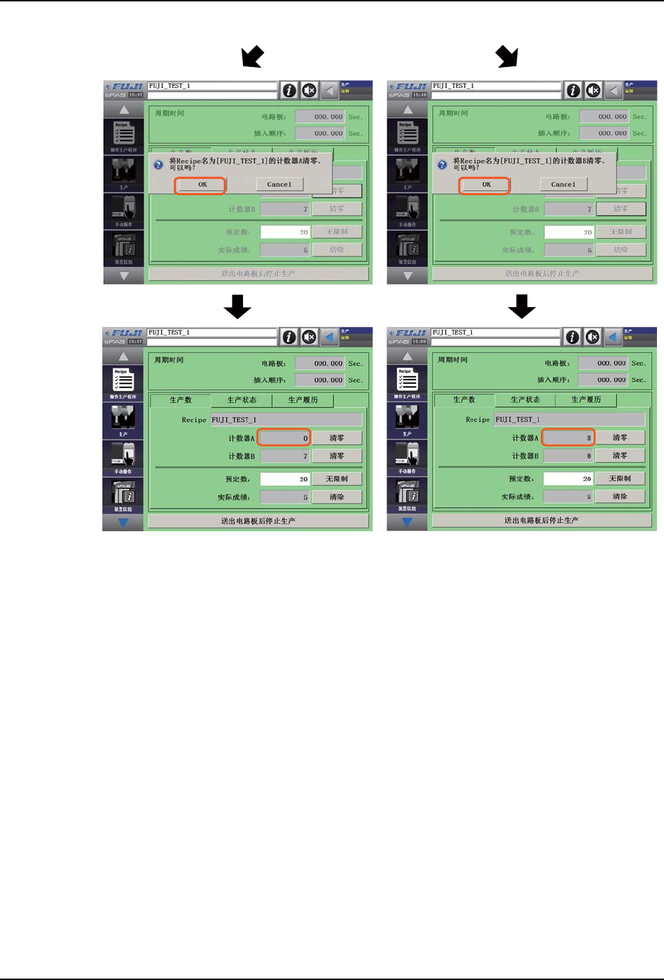 OPE-SFAB-005S0 7. 生产 SmartFAB 操作手册 147 7.5 如何确认生产实绩 在清除生产实际成绩之前, 通过累积的计数器, 能够确认选择中的生产程序和过去的 生产程 序的生产实际成绩。 1. 打开运转画面。 计数器 A 和计数器 B 的数值是选择中生产程序的累积的生产实际成绩。 2. 按下计数器 A:[ 清零 ]、计数器 B:[ 清零 ] 后,将对应的计数器设定为 [0]。 39OPE-0180-Sa 39OP…