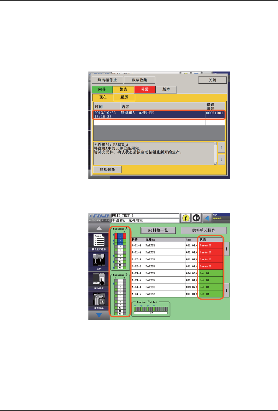 1. 发生料尽,不能继续生产时,机器就会暂时中断生产。中断后,机器在信息画面 (警