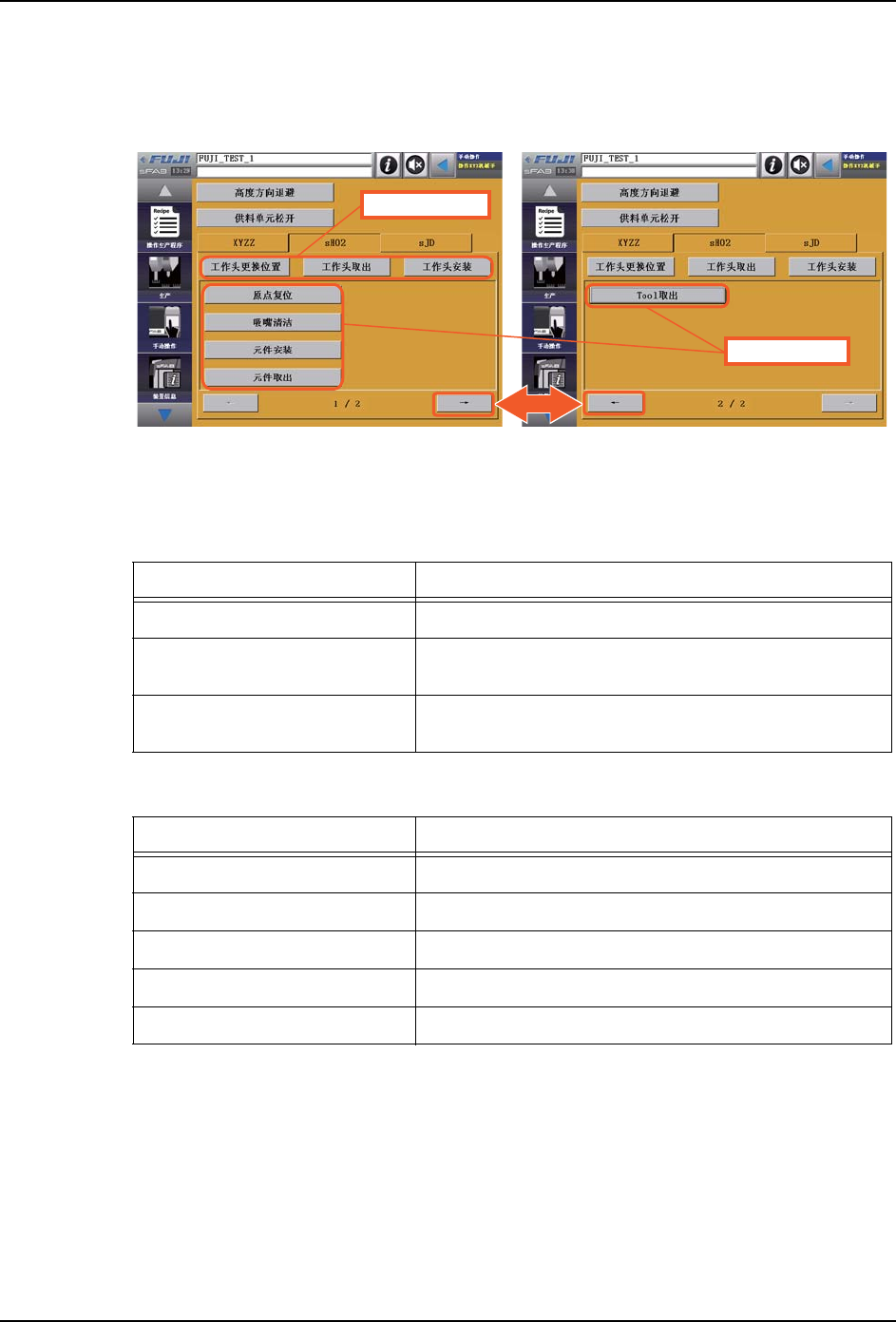 8. 关于手动操控 OPE-SFAB-005S0 160 SmartFAB 操作手册 8.3 如何操控 L 工作头 在 [手动操作]功能子菜单中,按下 [ L 工作头操作]按钮,则会显示 L 工作头操作用的 画面。能够进行此画面上显示的 按钮范围内的手动操作。 L 工作头操 作画面显示例 (安装了 sH02 工作头时 (1/2 页 )) L 工作头操 作画面显示例 ( 安装了 sH02 工作头时 (2/2 页 )) 画面说明 ( L 工…