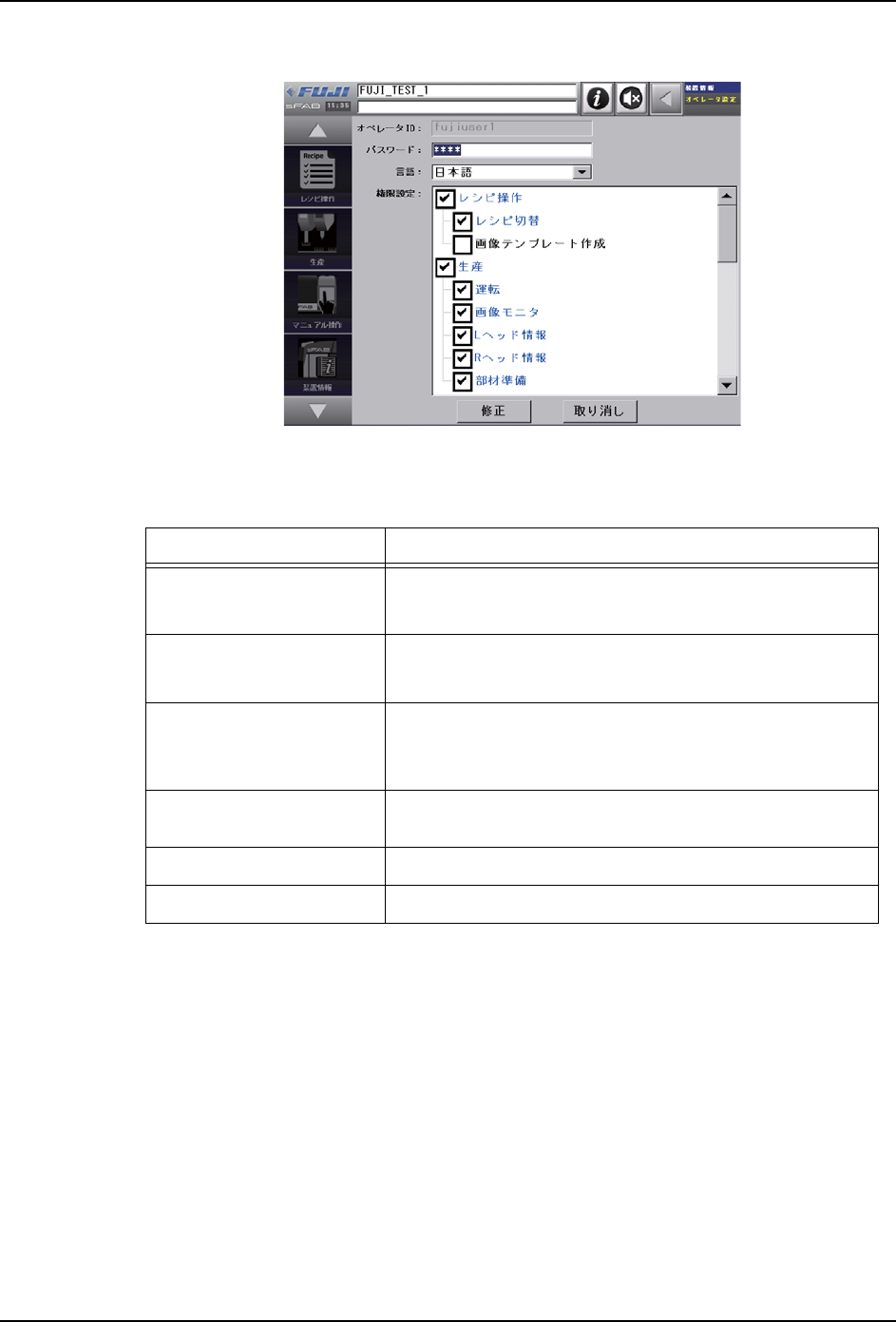 9. 系统管理 OPE-SFAB-005S0 186 SmartFAB 操作手册 9.1.2 操作员参照/修正时的画面说明 图 9.6. 操作员参照 / 修正时的画面 画面说明 名称 说明 [ 操作员 ID] 显示所注册的操作员 ID。 备注 )不能修正操作员 ID。 [ 密码 ] 键盘输入所注册的密码。 备注 )区分大小写。 [ 语言 ] 从日文、英文、中文 (简体字)中,选择语言。 注意 )即使完成该设置,影像模版创建界面、影像监 …