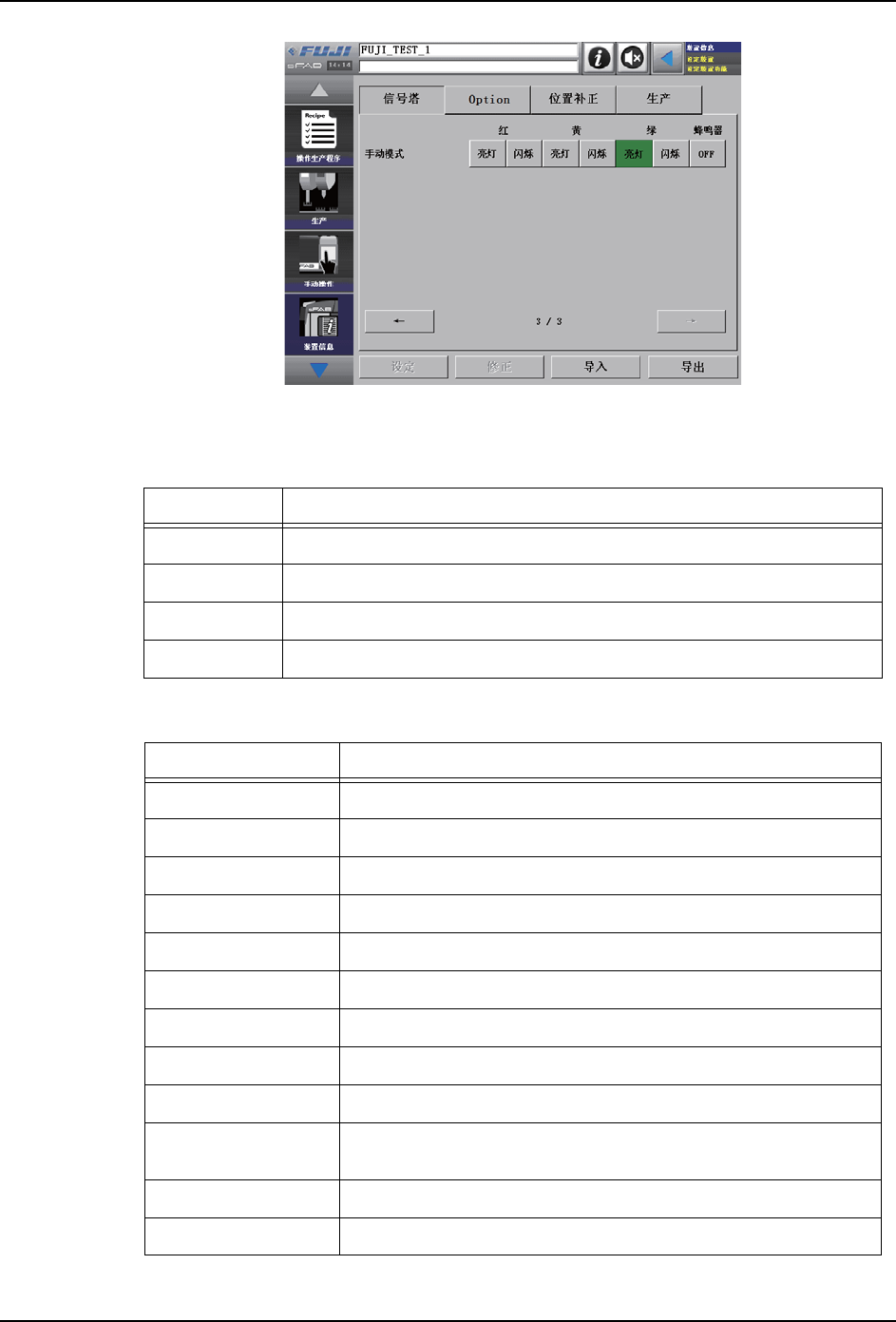 OPE-SFAB-005S0 9. 系统管理 SmartFAB 操作手册 201 图 9.11. 信号塔设定 (第 3 页) 画面说明 (按钮) 机器状态说明 名称 说明 [ 亮灯 ] 设定或者解除指示灯亮灯。设定后,根据指示灯 的颜色显示按钮。 [ 闪烁 ] 设定或者解除指示灯闪烁。设定后,根据指示灯 的颜色显示按钮。 [ON / OFF] 设定是否进行蜂鸣器鸣叫。蜂鸣器 鸣叫 ON 设定时,按钮以蓝色显示。 [ ← ],[ → ] …